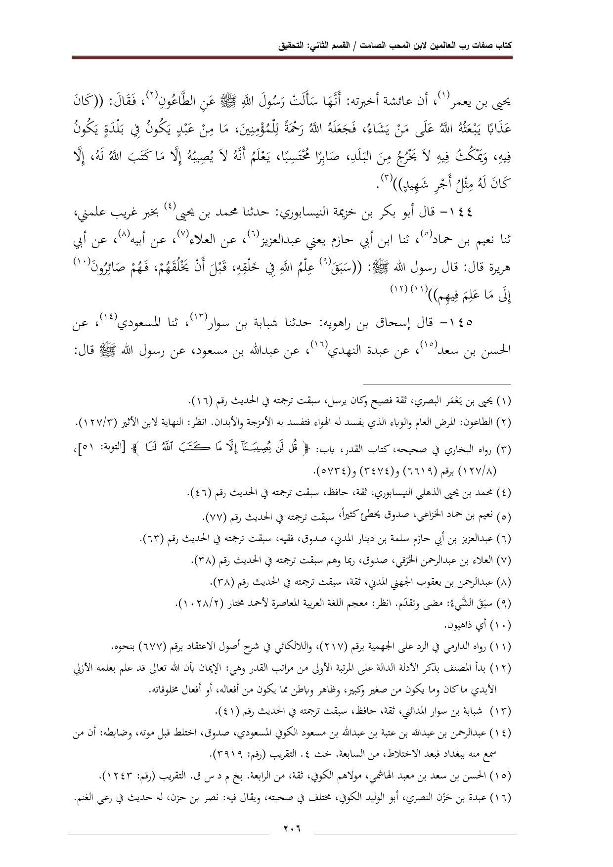 ١٤٤ - قال أبو بكر بن خزيمة النيسابوري: حدثنا محمد بن يحيى (¬٤) بخبر غريب علمني، ثنا نعيم بن حماد (¬٥)، ثنا ابن أبي حازم يعني عبد العزيز (¬٦)، عن العلاء (¬٧)، عن أبيه (¬٨)، عن أبي هريرة قال: قال رسول الله - صلى الله عليه وسلم -: "سَبَقَ (¬٩) عِلْمُ اللَّهِ فِي خَلْقِهِ، قَبْلَ أَنْ يَخْلُقَهُمْ، فَهُمْ صَائِرُونَ (¬١٠) إِلَى مَا عَلِمَ فِيهِم" (¬١١) (¬١٢).