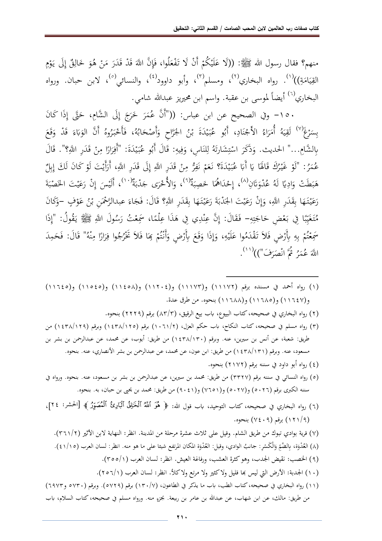 ١٥٠ - وفي الصحيح عن ابن عباس: "أَنَّ عُمَرَ خَرَجَ إِلَى الشَّامِ، حَتَّى إِذَا كَانَ بِسَرْغَ (¬٧) لَقيَهُ أُمَرَاءُ الأَجْنَادِ، أَبُو عُبَيْدَةَ بْنُ الجَرَّاحِ وَأَصْحَابُه، فَأَخْبَرُوهُ أَنَّ الوَبَاءَ قَدْ وَقَعَ بِالشَّامِ ... " الحديث. وَذكَرَ اسْتِشَارتَهُ لِلنَاسِ، وَفِيهِ: قَالَ أَبُو عُبَيْدَةَ: "أَفِرَارًا مِنْ قَدَرِ اللَّهِ؟ ". قَالَ عُمَرُ: "لَوْ غَيْرُكَ قَالَهَا يَا أَبَا عُبَيْدَةَ؟ نَعَمْ نَفِرُّ مِنْ قَدَرِ اللَّهِ إِلَى قَدَرِ اللَّهِ، أَرَأَيْتَ لَوْ كَانَ لَكَ إِبِلٌ هَبَطَتْ وَادِيًا لَهُ عُدْوَتَانِ (¬٨)، إِحْدَاهُمَا خَصِبَةٌ (¬٩)، وَالأُخْرَى جَدْبَةٌ (¬١٠)، أَليْسَ إِنْ رَعَيْتَ الخَصْبَةَ رَعَيْتَهَا بِقَدَرِ اللَّهِ، وَإنْ رَعَيْتَ الجَدْبَةَ رَعَيْتَهَا بِقَدَرِ اللَّهِ؟ قَالَ: فَجَاءَ عبدالرَّحْمَنِ بْنُ عَوْفٍ - وَكَانَ مُتَغَيِّبًا فِي بَعْضِ حَاجَتِهِ - فَقَالَ: إِنَّ عِنْدِي فِي هَذَا عِلْمًا، سَمِعْتُ رَسُولَ اللَّهِ - صلى الله عليه وسلم - يَقُولُ: "إِذَا سَمِعْتُمْ بِهِ بِأَرْضٍ فَلا تَقْدَمُوا عَلَيْهِ، وَإذا وَقَعَ بِأَرْضٍ وَأَنْتمْ بِهَا فَلا تَخْرُجوا فِرَارًا مِنْهُ" قَالَ: فَحَمِدَ اللَّهَ عُمَرُ ثمَّ انْصرًفَ" (¬١١).