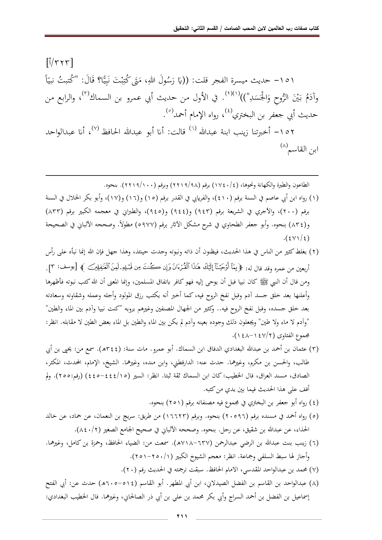 ١٥١ - حديث ميسرة الفجر قلت: ((يَا رَسُولَ اللهِ، مَتَى كتِبْتَ نَبِيًّا؟ قَالَ: "كُتبتُ نبيًّا وآدَمُ بَيْنَ الرُّوحِ وَالجسدِ" (¬١) (¬٢). في الأول من حديث أبي عمرو بن السماك (¬٣)، والرابع من حديث أبي جعفر بن البختري (¬٤)، رواه الإمام أحمد (¬٥).