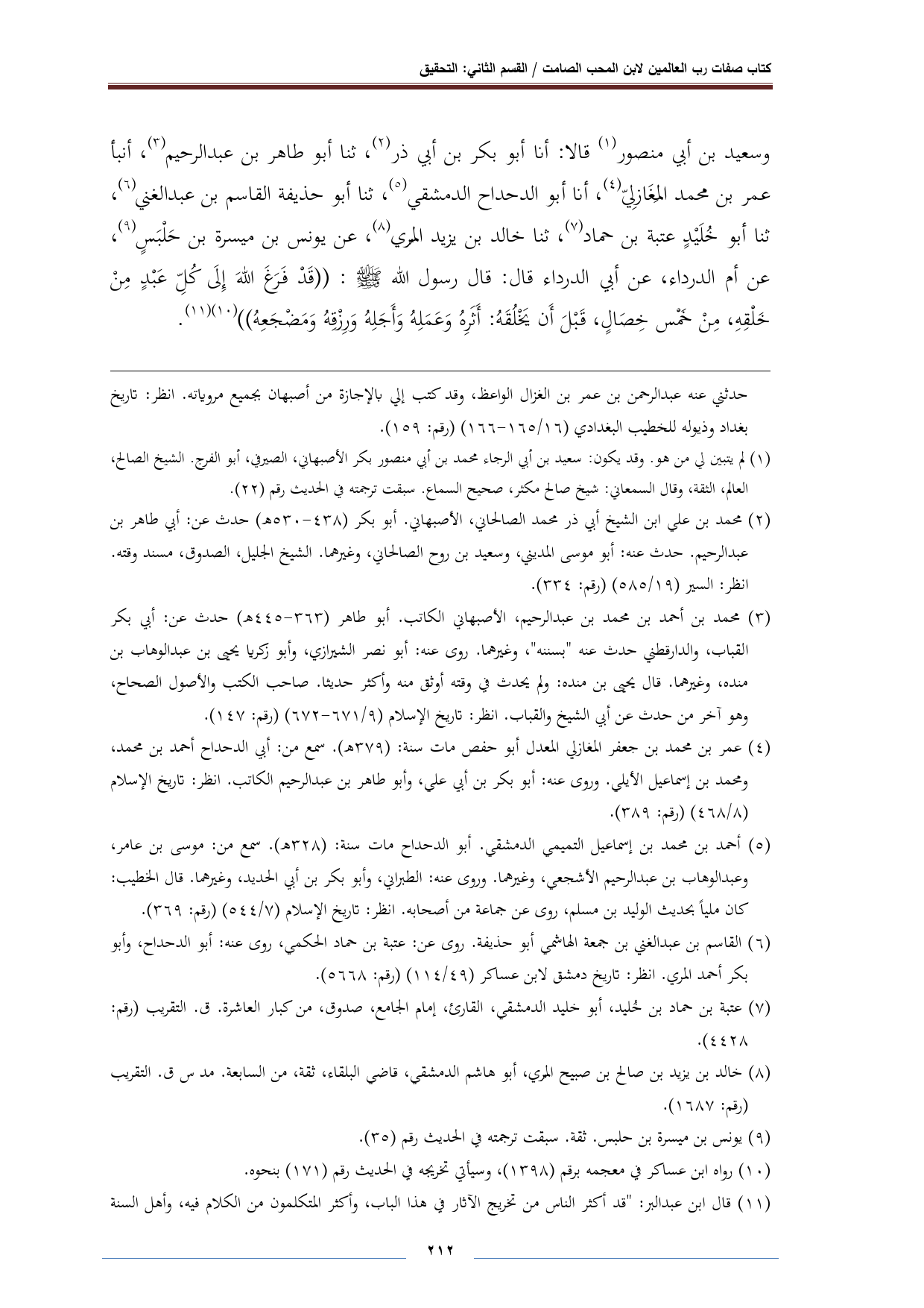 وسعيد بن أبي منصور (¬١) قالا: أنا أبو بكر بن أبي ذر (¬٢)، ثنا أبو طاهر بن عبد الرحيم (¬٣)، أنبأ عمر بن محمد المِغَازِليّ (¬٤)، أنا أبو الدحداح الدمشقي (¬٥)، ثنا أبو حذيفة القاسم بن عبد الغني (¬٦)، ثنا أبو خُلَيْدٍ عتبة بن حماد (¬٧)، ثنا خالد بن يزيد المري (¬٨)، عن يونس بن ميسرة بن حَلْبَسٍ (¬٩)، عن أم الدرداء، عن أبي الدرداء قال: قال رسول الله - صلى الله عليه وسلم -: "قَدْ فَرَغ اللهَ إِلَى كُلِّ عَبْدٍ مِنْ خَلْقِهِ، مِنْ خَمْس خِصَالٍ، قَبْلَ أَن يَخْلُقَهُ: أَثَرِهُ وَعَمَلِهُ وَأَجَلِهُ وَرِزْقِهُ وَمَضْجَعِهُ" (¬١٠) (¬١١).