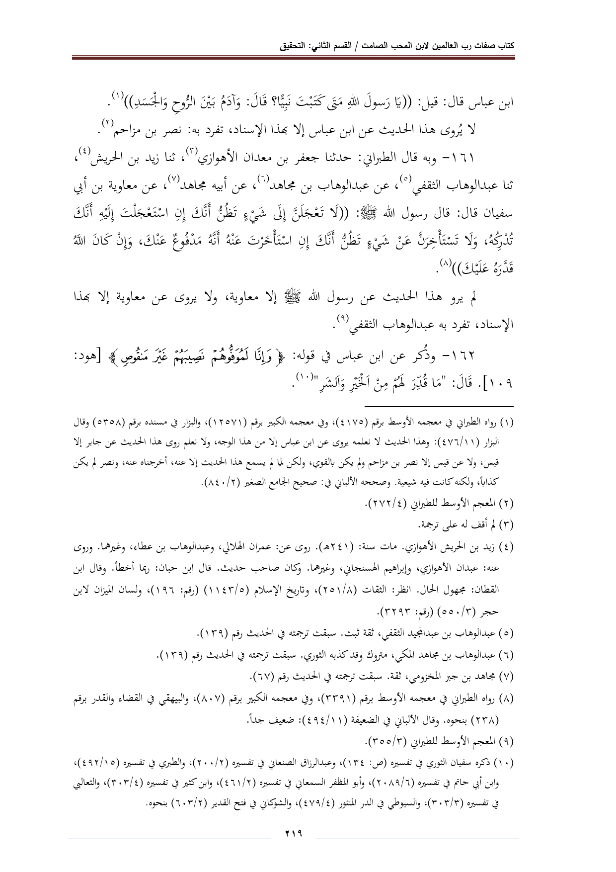 ١٦٢ - وذكر عن ابن عباس في قوله: {وَإِنَّا لَمُوَفُّوهُمْ نَصِيبَهُمْ غَيْرَ مَنْقُوصٍ} [هود: ١٠٩]. قَالَ: "مَا قُدِّرَ لَهُمْ مِنْ الْخَيْرِ وَالشَّرِّ" (¬١٠).