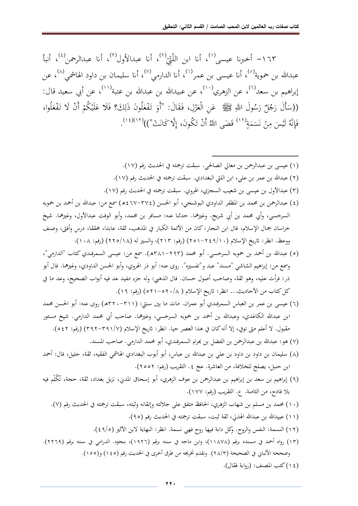 ١٦٣ - أخبرنا عيسى (¬١)، أنا ابن اللَّتِّيِّ (¬٢)، أنا عبد الأول (¬٣)، أنا عبد الرحمن (¬٤)، أنبأ عبد الله بن حموية (¬٥)، أنا عيسى بن عمر (¬٦)، أنا الدارمي (¬٧)، أنا سليمان بن داود الهاشمي (¬٨)، عن إبراهيم بن سعد (¬٩)، عن الزهري (¬١٠)، عن عبيد الله بن عبد الله بن عتبة (¬١١)، عن أبي سعيد قال: "سَأَلَ رَجُلٌ رَسُولَ اللَّهِ - صلى الله عليه وسلم - عَنِ الْعَزْلِ، فَقَالَ: "أَوَ تَفْعَلُونَ ذَلِكَ؟ فَلَا عَلَيْكُمْ أَنْ لَا تَفْعَلُوا، فَإِنَّهُ لَيْسَ مِنْ نَسَمَةٍ (¬١٢) قَضَى الله أَنْ تَكُونَ، إِلَّا كَانَتْ" (¬١٣) (¬١٤).