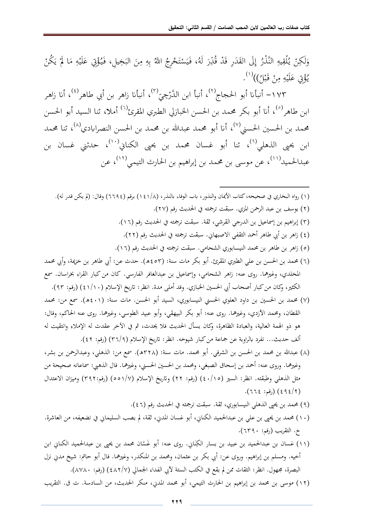 ١٧٣ - أنبأنا أبو الحجاج (¬٢)، أنبأ ابن الدِّرْجِيّ (¬٣)، أنبأنا زاهر بن أبي طاهر (¬٤)، أنا زاهر بن طاهر (¬٥)، أنا أبو بكر محمد بن الحسن الخبازلي الطبري المقرئ (¬٦) أملا، ثنا السيد أبو الحسن محمد بن الحسين الحسني (¬٧)، أنا أبو محمد عبد الله بن محمد بن الحسن النصرابادي (¬٨)، ثنا محمد بن يحيى الذهلي (¬٩)، ثنا أبو غسان محمد بن يحيى الكناني (¬١٠)، حدثني غسان بن عبد الحميد (¬١١)، عن موسى بن محمد بن إبراهيم بن الحارث التيمي (¬١٢)، عن