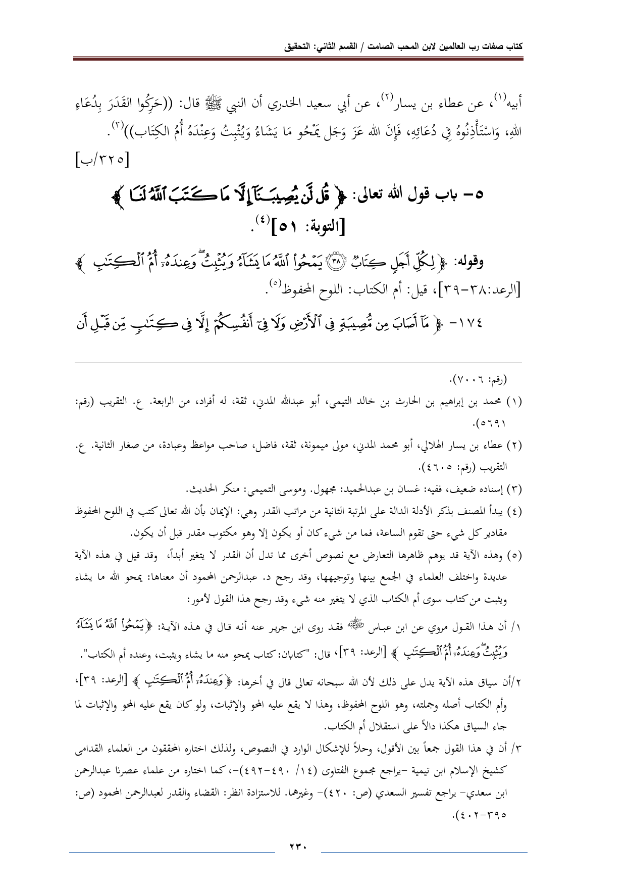(¬٥) وهذه الآية قد يوهم ظاهرها التعارض مع نصوص أخرى مما تدل أن القدر لا يتغير أبدًا، وقد قيل في هذه الآية عديدة واختلف العلماء في الجمع بينها وتوجيهها، وقد رجع د. عبد الرحمن المحمود أن معناها: يمحو الله ما يشاء ويثبت من كتاب سوى أم الكتاب الذي لا يتغير منه شيء وقد رجح هذا القول لأمور: