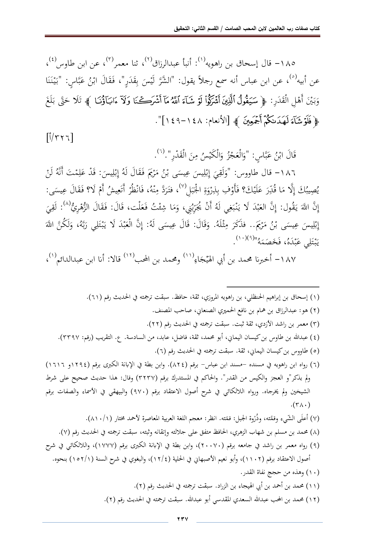 ١٨٥ - قال إسحاق بن راهويه (¬١): أنبأ عبد الرزاق (¬٢)، ثنا معمر (¬٣)، عن ابن طاوس (¬٤)، عن أبيه (¬٥)، عن ابن عباس أنه سمع رجلًا يقول: "الشَّرَّ لَيْسَ بِقَدَرٍ"، فَقَالَ ابْنُ عَبَّاسٍ: "بَيْنَنَا وَبَيْنَ أَهْلِ الْقَدَرِ: {سَيَقُولُ الَّذِينَ أَشْرَكُوا لَوْ شَاءَ اللَّهُ مَا أَشْرَكْنَا وَلَا آبَاؤُنَا} تَلَا حَتَّى بَلَغَ {فَلَوْ شَاءَ لَهَدَاكُمْ أَجْمَعِينَ} [الأنعام: ١٤٨ - ١٤٩] ".