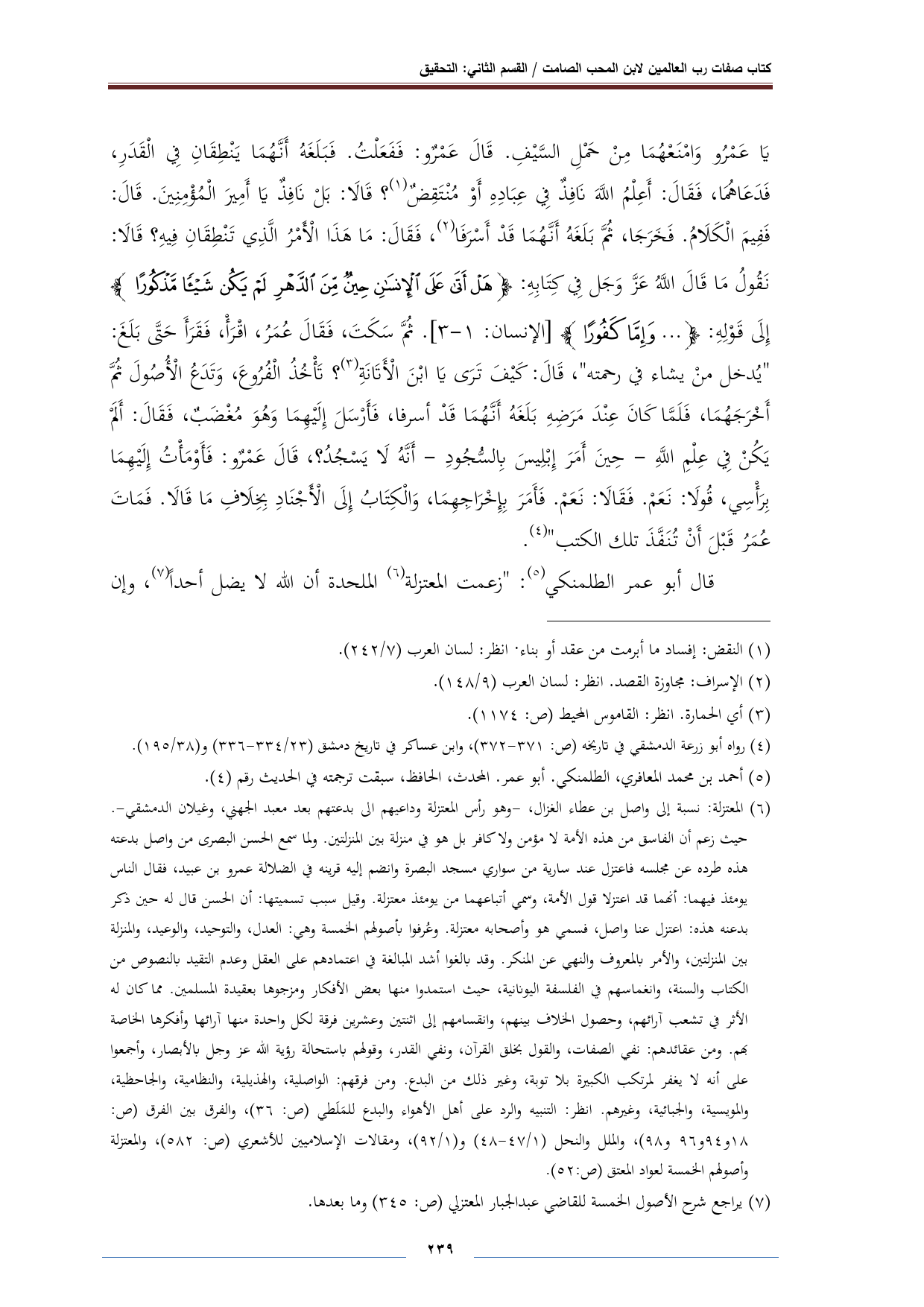 (¬٧) يراجع شرح الأصول الخمسة للقاضي عبد الجبار المعتزلي (ص: ٣٤٥) وما بعدها.