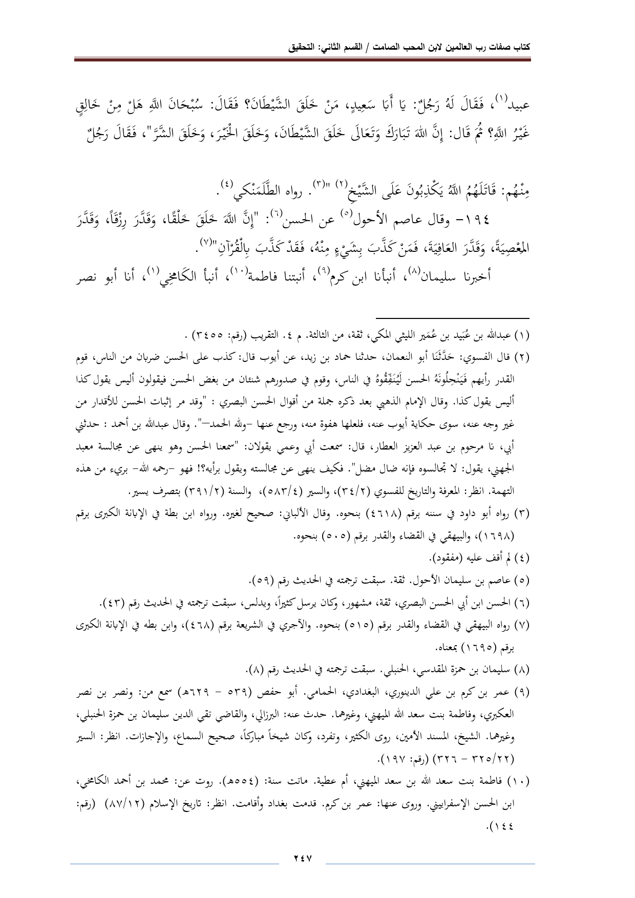 عبيد (¬١)، فَقَالَ لَه رَجُلٌ: يَا أَبَا سَعِيدٍ، مَنْ خَلَقَ الشَّيْطَانَ؟ فَقَالَ: سُبْحَانَ اللَّهِ هَلْ مِنْ خَالِقٍ غَيْرُ اللهِ؟ ثُمَ قَال: إِنَّ اللهَ تَبَارَكَ وَتَعَالَى خَلَقَ الشَّيْطَانَ، وَخَلَقَ الخيْرَ، وَخَلَقَ الشَّرَّ"، فَقَالَ رَجُلٌ مِنْهُم: قَاتَلَهُمُ اللَّهُ يَكْذِبُونَ عَلَى الشَّيْخِ (¬٢) " (¬٣). رواه الطَّلَمَنْكي (¬٤).