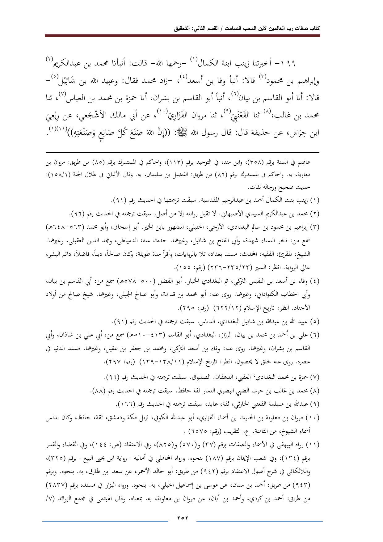 ١٩٩ - أخبرتنا زينب ابنة الكمال (¬١) - رحمها الله - قالت: أنبأنا محمد بن عبد الكريم (¬٢) وإبراهيم بن محمود (¬٣) قالا: أنبأ وفا بن أسعد (¬٤)، - زاد محمد فقال: وعبيد الله بن شَاتِيْل (¬٥) - قالا: أنا أبو القاسم بن بيان (¬٦)، أنبأ أبو القاسم بن بشران، أنا حمزة بن محمد بن العباس (¬٧)، ثنا محمد بن غالب، (¬٨) ثنا القَعْنَبِي (¬٩)، تنا مروان الفَزَارِيّ (¬١٠)، عن أبي مالك الأشْجَعي، عن رِبْعِيّ بن حِرَاش، عن حذيفة قال: قال رسول الله - صلى الله عليه وسلم -: "إِنَّ اللهَ صَنَعَ كُلَّ صَانِعٍ وَصَنْعَتِهِ" (¬١١) (١٢).