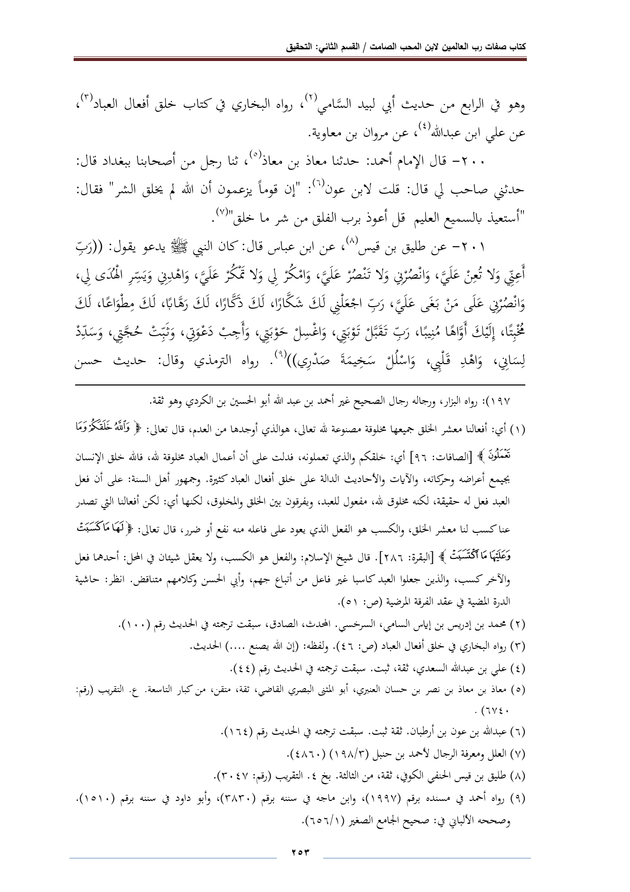 ٢٠٠ - قال الإمام أحمد: حدثنا معاذ بن معاذ (¬٥)، ثنا رجل من أصحابنا ببغداد قال: حدثني صاحب لي قال: قلت لابن عون (¬٦): "إن قومًا يزعمون أن الله لم يخلق الشر" فقال: "أستعيذ بالسميع العليم قل أعوذ برب الفلق من شر ما خلق" (¬٧).