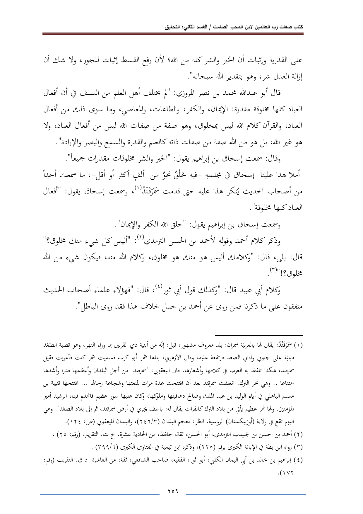 قال أبو عبد الله محمد بن نصر المروزي: "لم يختلف أهل العلم من السلف في أن أفعال العباد كلها مخلوقة مقدرة: الإيمان، والكفر، والطاعات، والمعاصي، وما سوى ذلك من أفعال العباد، والقرآن كلام الله ليس بمخلوق، وهو صفة من صفات الله ليس من أفعال العباد، ولا هو غير الله، بل هو من الله صفة من صفات ذاته كالعلم والقدرة والسمع والبصر والإرادة".
