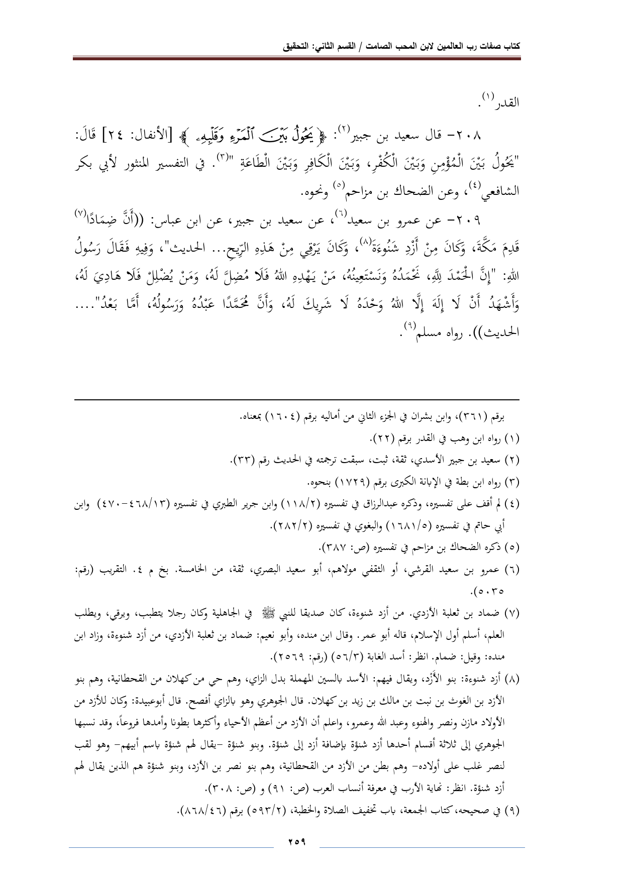 ٢٠٨ - قال سعيد بن جبير (¬٢): {يَحُولُ بَيْنَ الْمَرْءِ وَقَلْبِهِ} [الأنفال: ٢٤] قَالَ: "يحَولُ بَيْنَ الْمُؤْمِنِ وَبَيْنَ الْكفْرِ، وَبَيْنَ الْكَافِرِ وَبَيْنَ الْطَاعَةِ" (¬٣). في التفسير المنثور لأبي بكر الشافعي (¬٤)، وعن الضحاك بن مزاحم (¬٥) ونحوه.