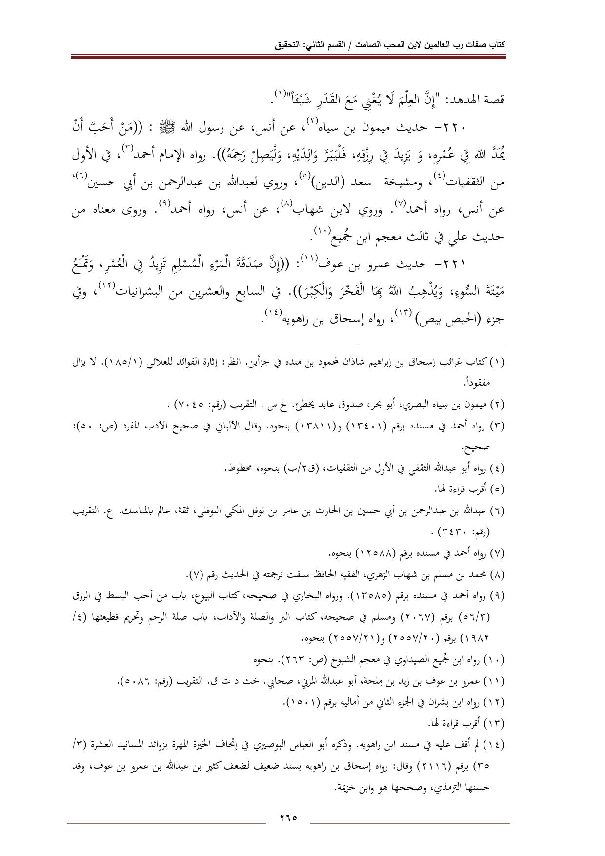 ٢٢٠ - حديث ميمون بن سياه (¬٢)، عن أنس، عن رسول الله - صلى الله عليه وسلم -: "مَنْ أَحَبَّ أَنْ يُمَدَّ الله فِي عُمْرِهِ، وَيَزِيدَ فِي رِزْقِهِ، فَلْيَبَرَّ وَالِدَيْهِ، وَلْيَصِلْ رَحِمَهُ". رواه الإمام أحمد (¬٣)، في الأول من الثقفيات (¬٤)، ومشيخة سعد (الدين) (¬٥)، وروي لعبد الله بن عبد الرحمن بن أبي حسين (¬٦)، عن أنس، رواه أحمد (¬٧). وروي لابن شهاب (¬٨)، عن أنس، رواه أحمد (¬٩). وروى معناه من حديث علي في ثالث معجم ابن جُميع (¬١٠).