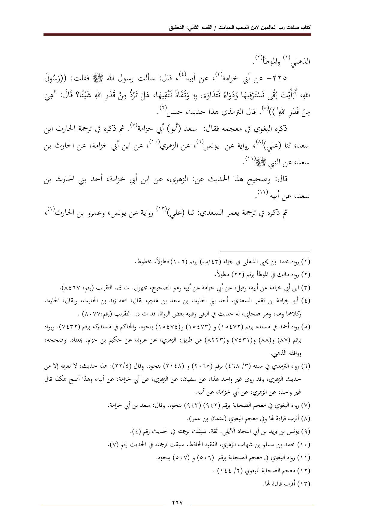 ٢٢٥ - عن أبي خزامة (¬٣)، عن أبيه (¬٤)، قال: سألت رسول الله - صلى الله عليه وسلم - فقلت: "رَسُولَ اللهِ، أَرَأَيْتَ رُقًى نَسْتَرْقِيهَا وَدَوَاءً نَتَدَاوَى بِهِ وَتُقَاةً نَتَّقِيهَا، هَلْ تَرُدّ مِنْ قَدَرِ اللهِ شَيْئًا؟ قَالَ: "هِيَ مِنْ قَدَرِ اللهِ" (¬٥). قال الترمذي هذا حديث حسن (¬٦).