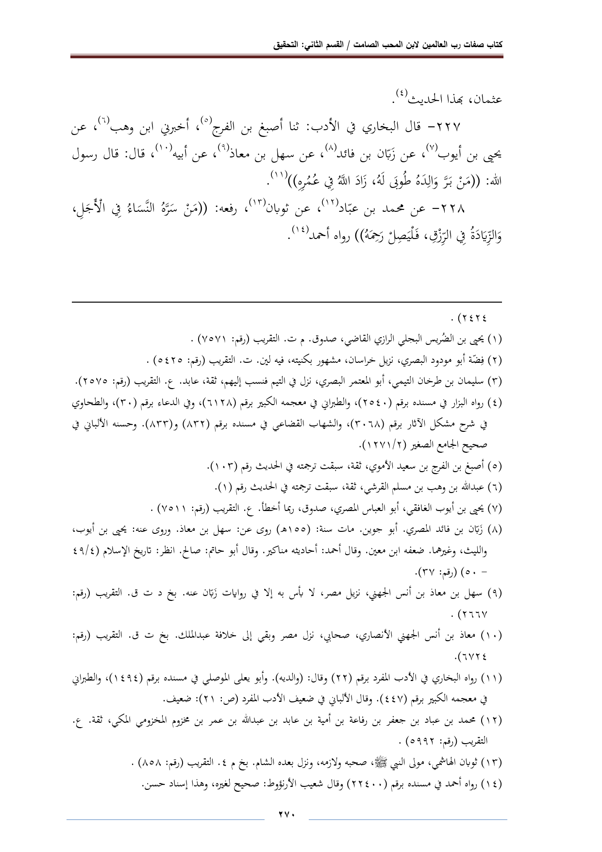 ٢٢٨ - عن محمد بن عبّاد (¬١٢)، عن ثوبان (¬١٣)، رفعه: "مَنْ سرَّهُ النَّسَاءُ فِي الْأَجَلِ، وَالزِّيَادَةُ فِي الرِزْقِ، فَلْيَصِل رَحِمه" رواه أحمد (¬١٤).