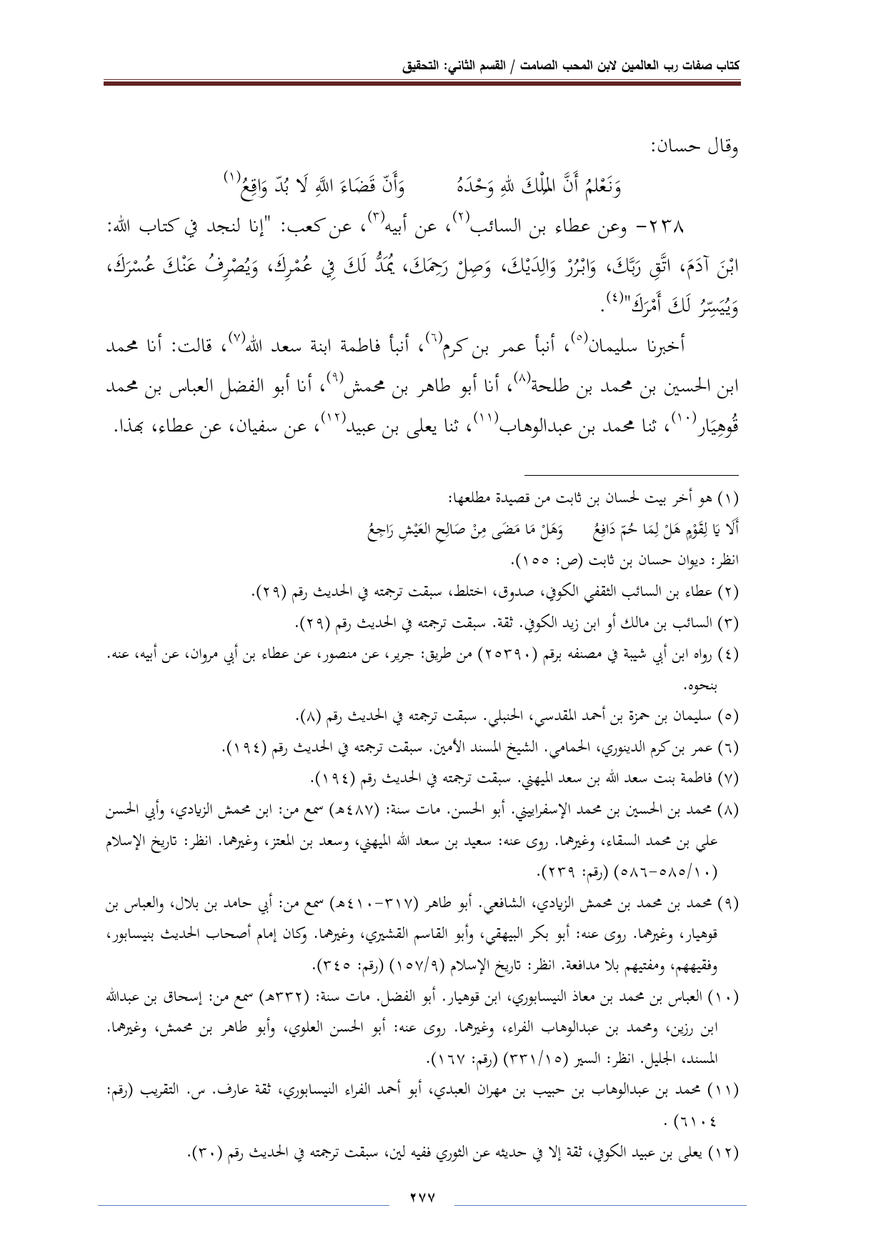 ٢٣٨ - وعن عطاء بن السائب (¬٢)، عن أبيه (¬٣)، عن كعب: "إنا لنجد في كتاب الله: ابْنَ آدَمَ، اتَّقِ رَبَّكَ، وَابْرُرْ وَالِدَيْكَ، وَصِلْ رَحِمَكَ، يُمَدُّ لَكَ فِي عُمْرِكَ، وَيُصْرِفُ عَنْكَ عُسْرَكَ، وَيُيَسِّرُ لَكَ أَمْرَكَ" (¬٤).