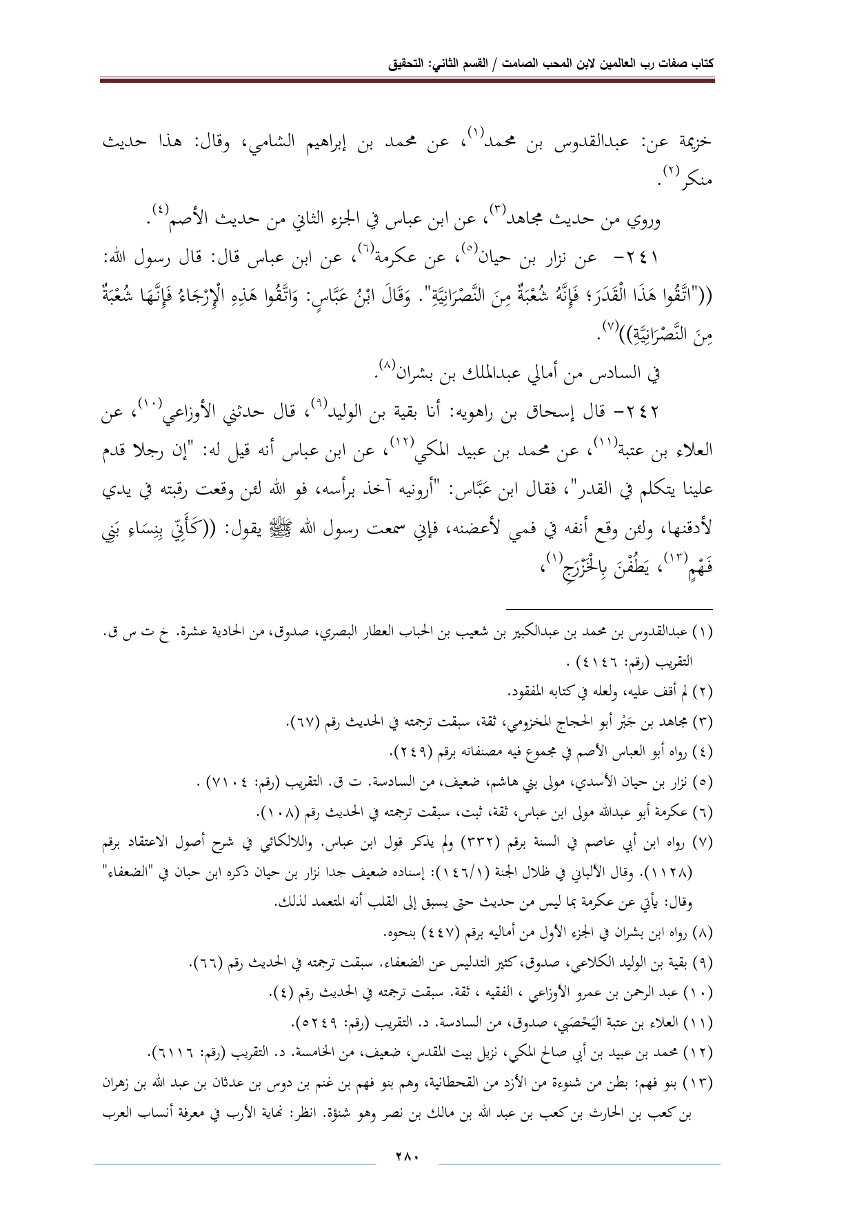 ٢٤٢ - قال إسحاق بن راهويه: أنا بقية بن الوليد (¬٩)، قال حدثني الأوزاعي (¬١٠)، عن العلاء بن عتبة (¬١١)، عن محمد بن عبيد المكي (¬١٢)، عن ابن عباس أنه قيل له: "إن رجلا قدم علينا يتكلم في القدر"، فقال ابن عَبَّاس: "أرونيه آخذ برأسه، فوالله لئن وقعت رقبته في يدي لأدقنها، ولئن وقع أنفه في فمي لأعضنه، فإني سمعت رسول الله - صلى الله عليه وسلم - يقول: "كَأَنِّي بِنِسَاءِ بَنِي فَهْمٍ (¬١٣)، يَطفْنَ بِالخزْرَجِ (١٤).
