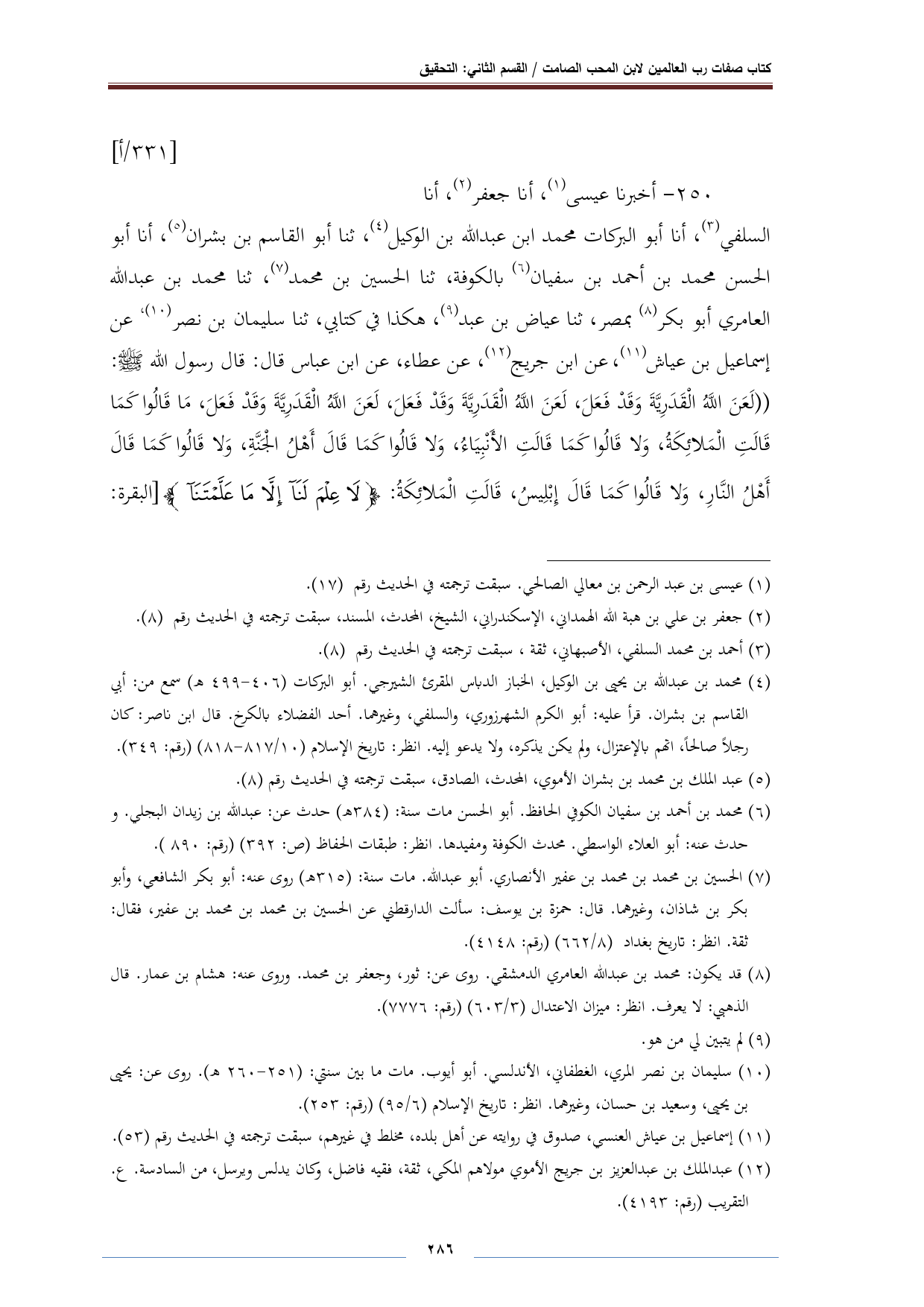 السلفي (¬٣)، أنا أبو البركات محمد بن عبد الله بن الوكيل (¬٤)، ثنا أبو القاسم بن بشران (¬٥)، أنا أبو الحسن محمد بن أحمد بن سفيان (¬٦) بالكوفة، ثنا الحسين بن محمد (¬٧)، ثنا محمد بن عبد الله العامري أبو بكر (¬٨) بمصر، ثنا عياض بن عبد (¬٩)، هكذا في كتابي، ثنا سليمان بن نصر (¬١٠)، عن إسماعيل بن عياش (¬١١)، عن ابن جريج (¬١٢)، عن عطاء، عن ابن عباس قال: قال رسول الله - صلى الله عليه وسلم -: "لَعَنَ اللهُ الْقَدَرِيَّةَ وَقَدْ فَعَلَ، لَعَنَ اللَّهُ الْقَدَرِيَّةَ وَقَدْ فَعَلَ، لَعَنَ اللَّهُ الْقَدَرِيَّةَ وَقَدْ فَعَلَ، مَا قَالُوا كَمَا قَالَتِ الْمَلائِكَة، وَلا قَالُوا كَمَا قَالَتِ الأَنْبِيَاء، وَلا قَالُوا كَمَا قَالَ أَهْلُ الجنَّةِ، وَلا قَالُوا كَمَا قَالَ أَهْلُ النَّارِ، وَلا قَالُوا كَمَا قَالَ إِبْلِيس، قَالَتِ الْمَلائِكَة: {لَا عِلْمَ لَنَا إِلَّا مَا عَلَّمْتَنَا} [البقرة: