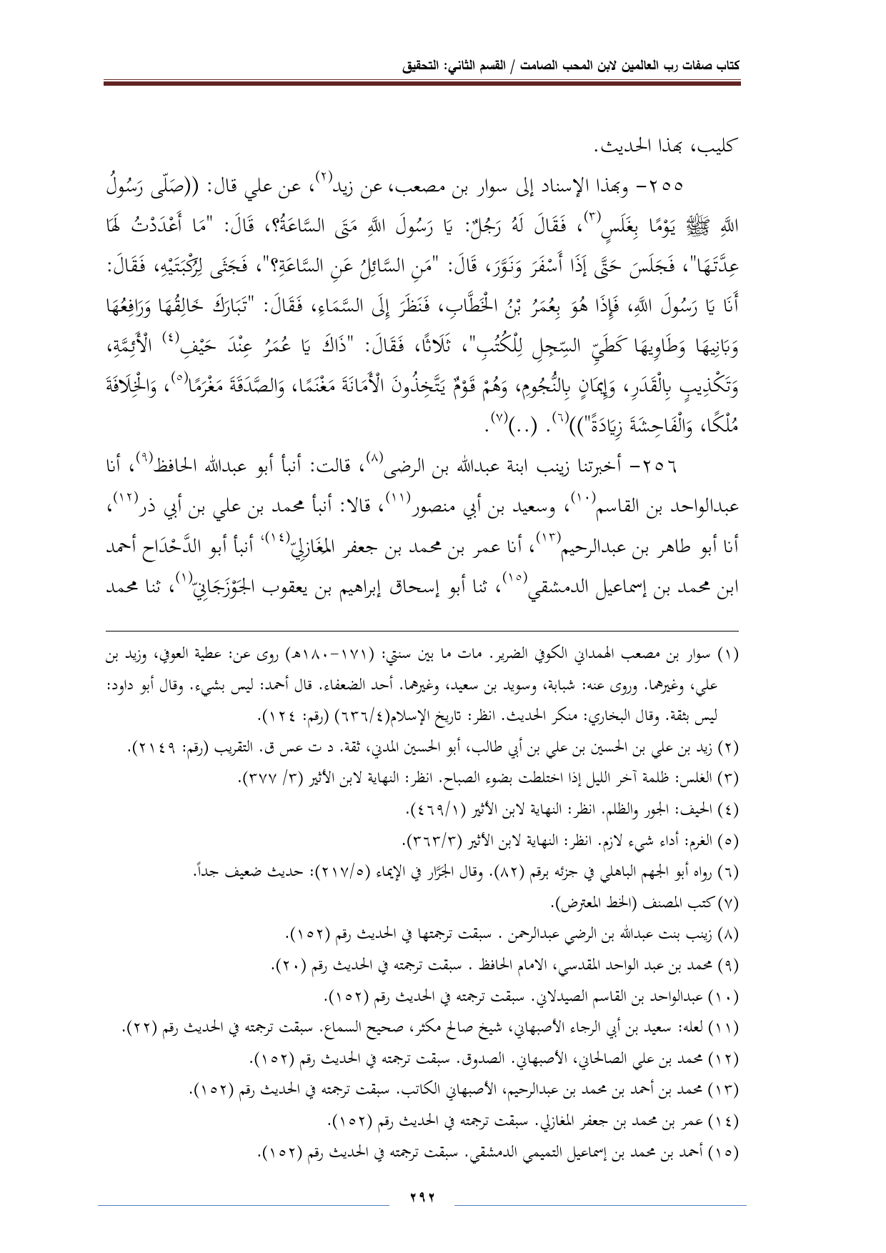 ٢٥٥ - وبهذا الإسناد إلى سوار بن مصعب، عن زيد (¬٢)، عن علي قال: "صَلّى رَسُولُ اللَّهِ - صلى الله عليه وسلم - يَوْمًا بِغَلَسٍ (¬٣)، فَقَالَ لَهُ رَجُلٌ: يَا رَسُولَ اللَّه مَتَى السَّاعَةُ؟، قَالَ: "مَا أَعْدَدْتُ لَهَا عِدَّتَهَا"، فَجَلَسَ حَتَّى إَذَا أَسْفَرَ وَنَوَّرَ، قَالَ: "مَنِ السَّائِلُ عَنِ السَّاعَةِ؟ "، فَجَثَى لِركبَتَيْهِ، فَقَالَ: أَنَا يَا رَسُولَ اللَّهِ، فَإِذَا هُوَ بِعُمَر بْنُ الخطِّابِ، فَنَظَرَ إِلَى السَّمَاءِ، فَقَالَ: "تَبَارَكَ خَالِقُهَا وَرَافِعُهَا وَبَانِيهَا وَطَاوِيهَا كَطَيِّ السِّجِلِ لِلْكُتُبِ"، ثَلَاثًا، فَقَالَ: "ذَاكَ يَا عُمَرُ عِنْدَ حَيْفِ (¬٤) الْأَئِمَّةِ، وَتَكْذِيبٍ بِالْقَدَرِ، وَإيمَانٍ بِالنُّجُومِ، وَهُمْ قَوْمٌ يَتَّخِذُونَ الْأَمَانَةَ مَغْنَمًا، وَالصَّدَقَةَ مَغْرَمًا (¬٥)، وَالخلَافَةَ مُلْكًا، وَالْفَاحِشَةَ زِيَادَةً"" (¬٦). ( .. ) (¬٧).