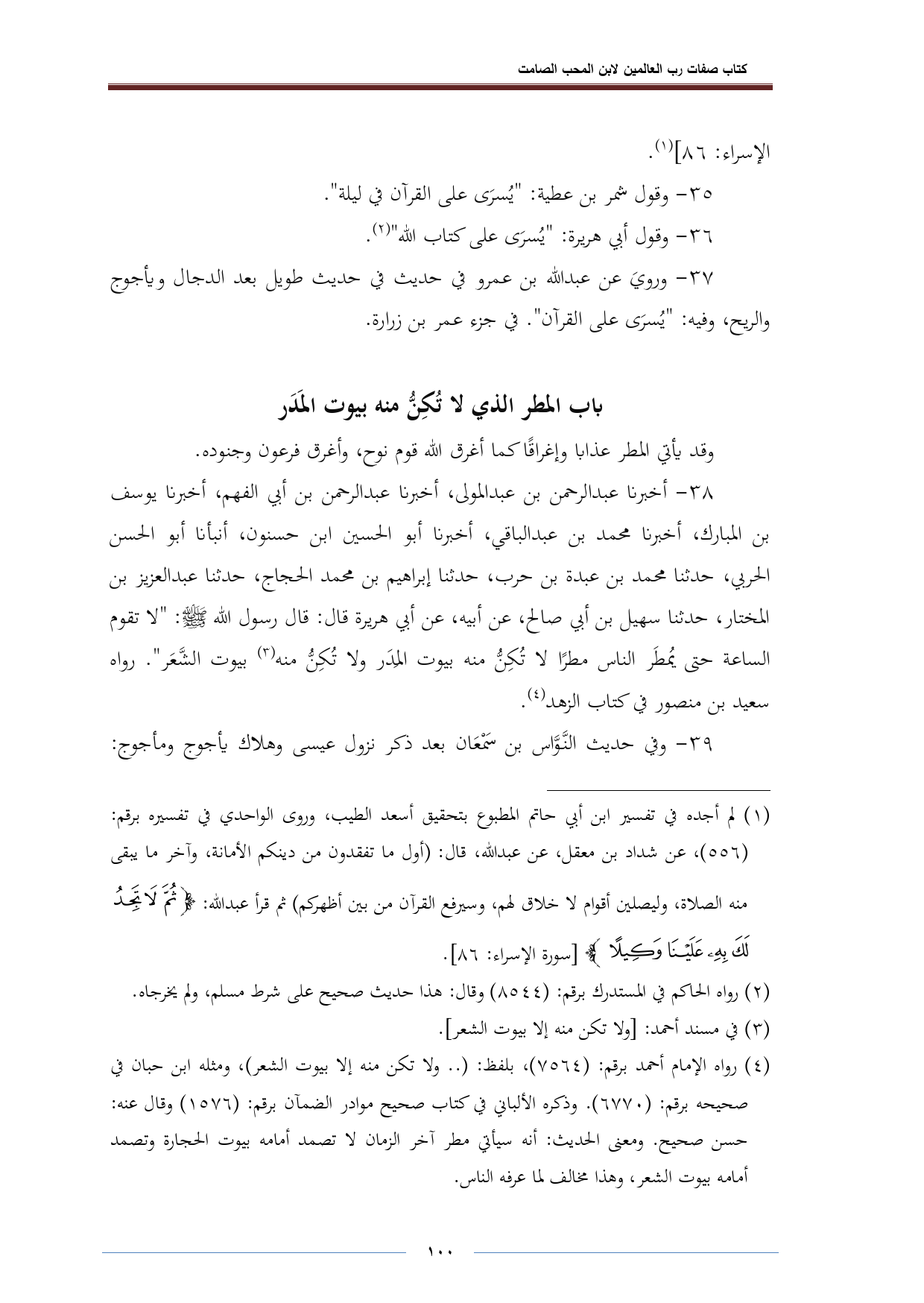 (¬٤) رواه الإمام أحمد برقم: (٧٥٦٤)، بلفظ: ( .. ولا تكن منه إلا بيوت الشعر)، ومثله ابن حبان في صحيحه برقم: (٦٧٧٠). وذكره الألباني في كتاب صحيح موادر الضمآن برقم: (١٥٧٦) وقال عنه: حسن صحيح. ومعنى الحديث: أنه سيأتي مطر آخر الزمان لا تصمد أمامه بيوت الحجارة وتصمد أمامه بيوت الشعر، وهذا مخالف لما عرفه الناس.
