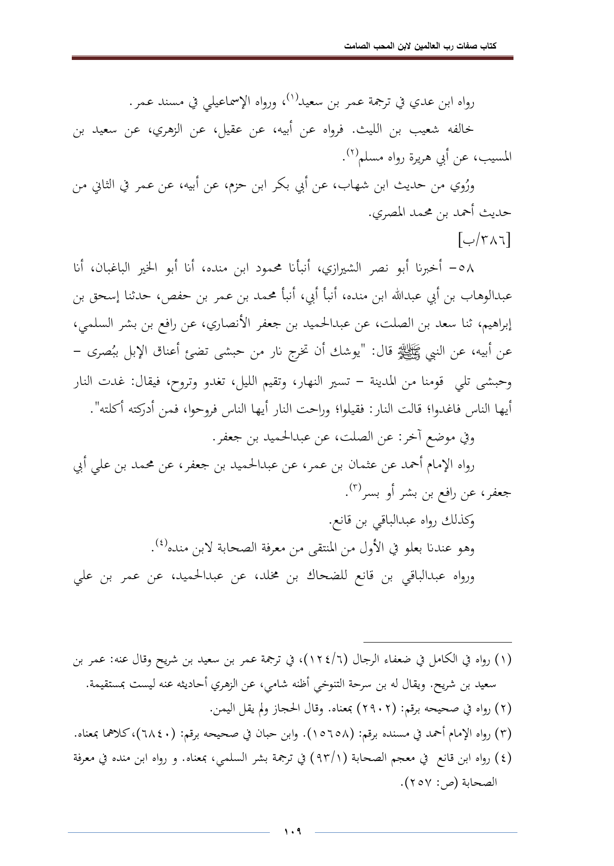 ٥٨ - أخبرنا أبو نصر الشيرازي، أنبأنا محمود ابن منده، أنا أبو الخير الباغبان، أنا عبد الوهاب بن أبي عبد الله ابن منده، أنبأ أبي، أنبأ محمد بن عمر بن حفص، حدثنا إسحق بن إبراهيم، ثنا سعد بن الصلت، عن عبد الحميد بن جعفر الأنصاري، عن رافع بن بشر السلمي، عن أبيه، عن النبي -صلى الله عليه وسلم- قال: "يوشك أن تخرج نار من حبشى تضئ أعناق الإبل ببُصرى -وحبشى تلي قومنا من المدينة- تسير النهار، وتقيم الليل، تغدو وتروح، فيقال: غدت النار أيها الناس فاغدوا؛ قالت النار: فقيلوا؛ وراحت النار أيها الناس فروحوا، فمن أدركته أكلته".