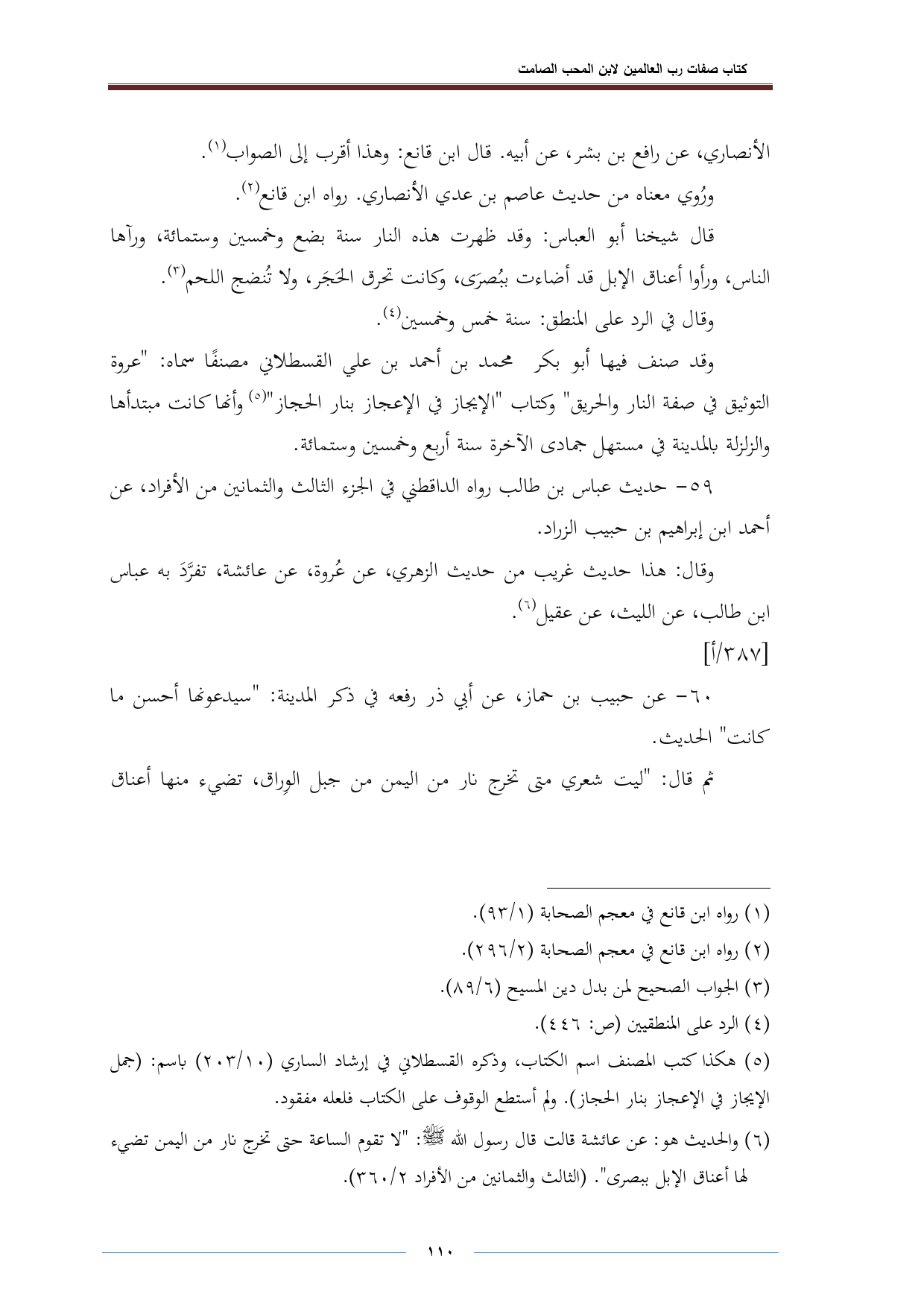 (¬٥) هكذا كتب المصنف اسم الكتاب، وذكره القسطلاني في إرشاد الساري (٢٠٣/ ١٠) باسم: (جمل الإيجاز في الإعجاز بنار الحجاز). ولم أستطع الوقوف على الكتاب فلعله مفقود.