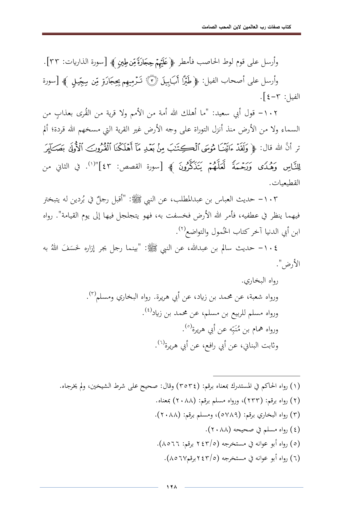١٠٣ - حديث العباس بن عبد المطلب، عن النبي -صلى الله عليه وسلم-: "أقبل رجلٌ في بُردين له يتبختر فيهما ينظر في عطفيه، فأمر الله الأرض فخسفت به، فهو يتجلجل فيها إلى يوم القيامة". رواه ابن أبي الدنيا آخر كتاب الخُمول والتواضع (¬٢).