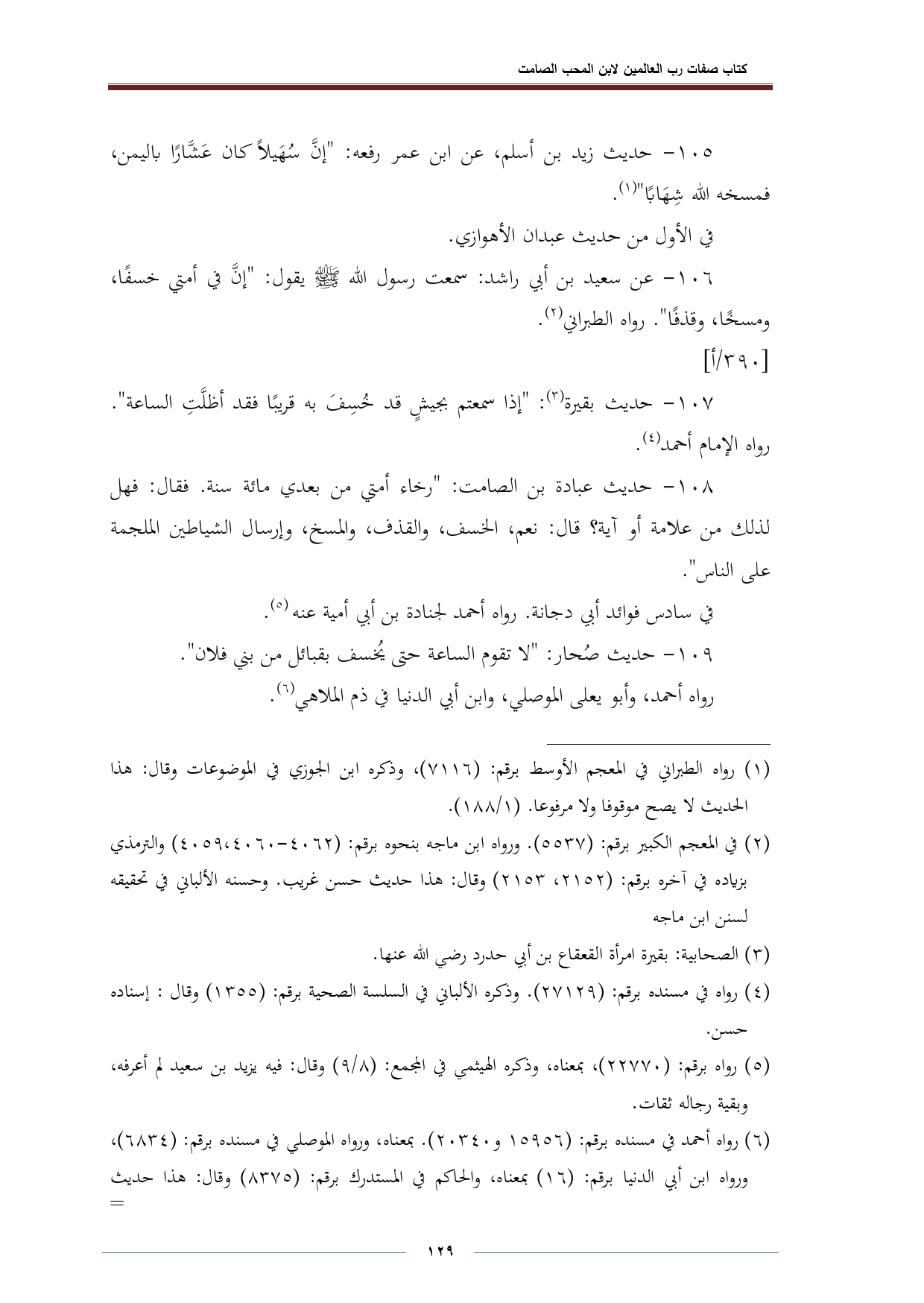 ١٠٨ - حديث عبادة بن الصامت: "رخاء أمتي من بعدي مائة سنة. فقال: فهل لذلك من علامة أو آية؟ قال: نعم، الخسف، والقذف، والمسخ، وإرسال الشياطين الملجمة على الناس".