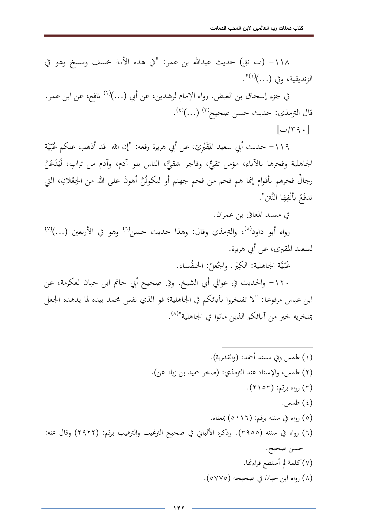 ١١٩ - حديث أبي سعيد المِقْبُريّ، عن أبي هريرة رفعه: "إن الله قد أذهب عنكم عُبّيَّة الجاهلية وفخرها بالآباء، مؤمن تقي، وفاجر شقيٌّ، الناس بنو آدم، وآدم من ترابِ، لَيَدَعَنَّ رجالٌ فخرهم بأقواتم إنما هم فحم من فحم جهنم أو ليكونُنَّ أهونَ على الله من الجِعْلانِ، التي تدفَعُ بأنْفِهَا النَّتن".