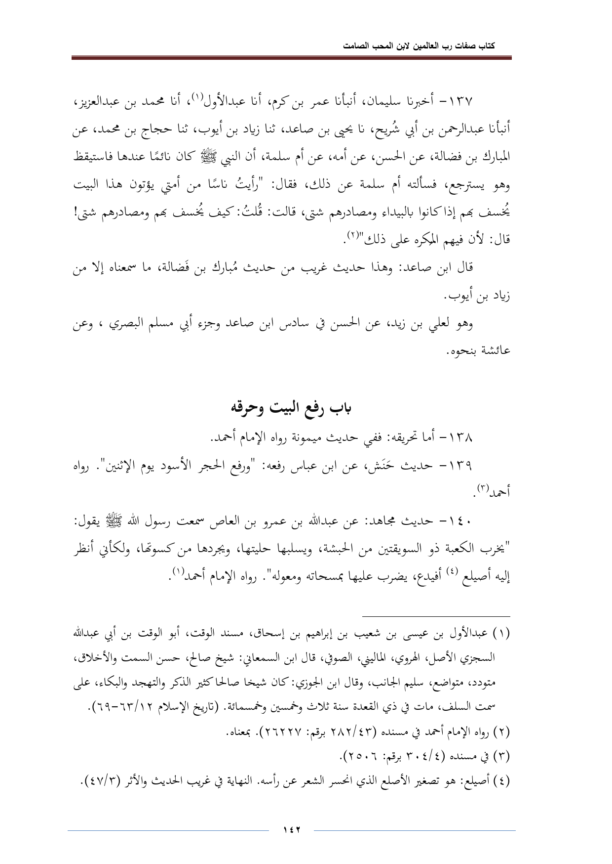 ١٤٠ - حديث مجاهد: عن عبد الله بن عمرو بن العاص سمعت رسول الله -صلى الله عليه وسلم- يقول: "يخرب الكعبة ذو السويقتين من الحبشة، ويسلبها حليتها، ويجردها من كسوتها، ولكأني انظر إليه أصيلع (¬٤) أفيدع، يضرب عليها بمسحاته ومعوله". رواه الإمام أحمد (٥).
