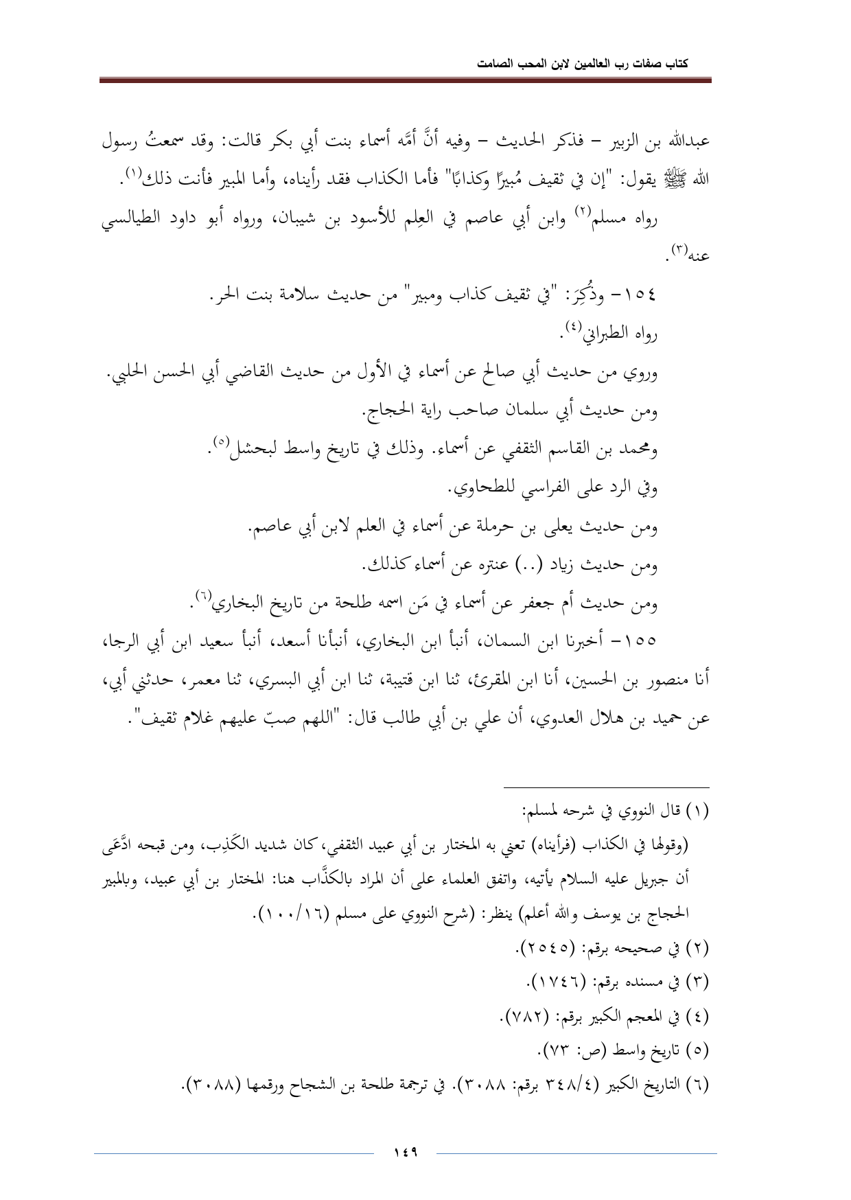 ١٥٤ - وذكِرَ: "في ثقيف كذاب ومبير" من حديث سلامة بنت الحر.