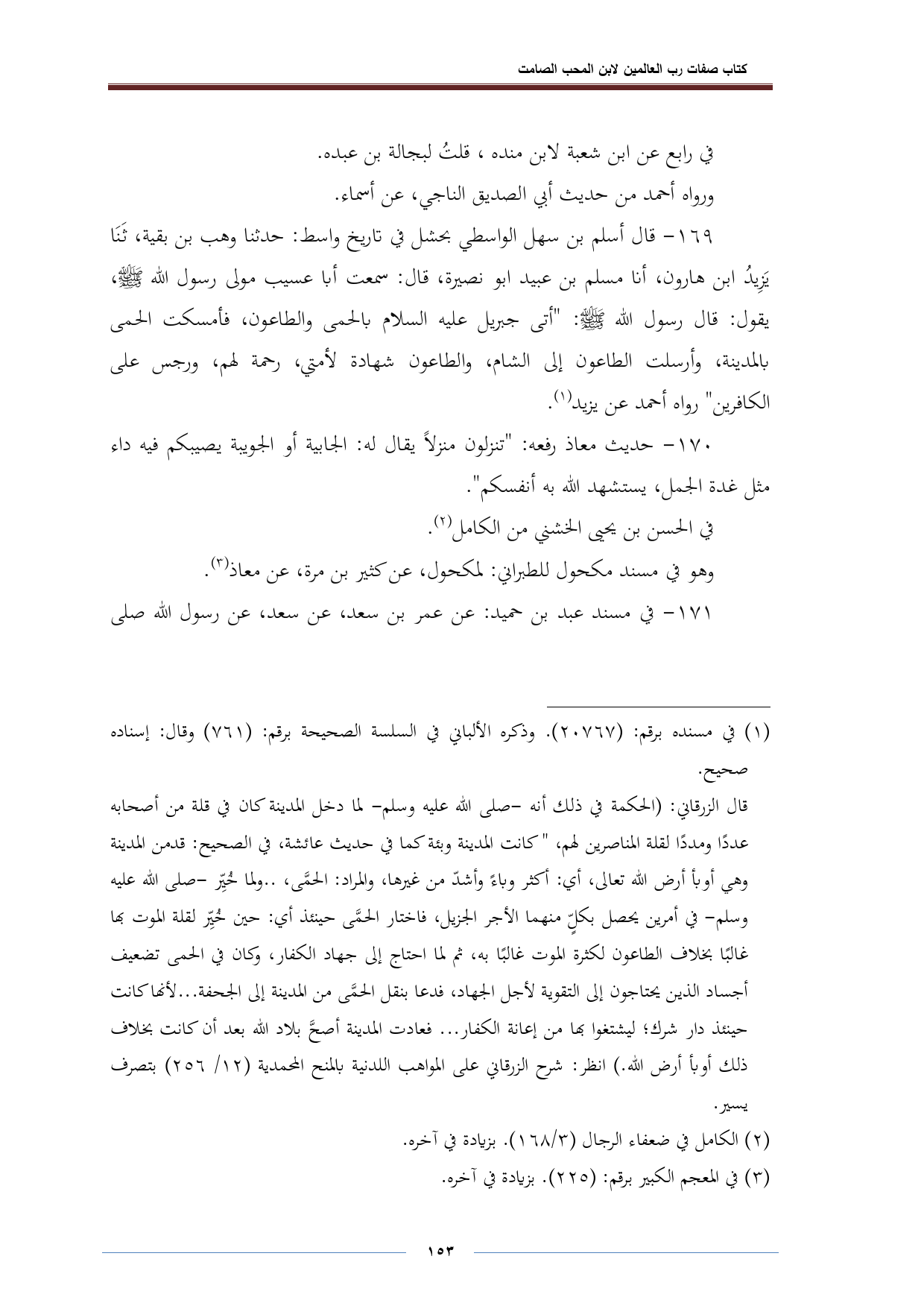 ١٦٩ - قال أسلم بن سهل الواسطي بحشل في تاريخ واسط: حدثنا وهب بن بقية، ثَنَا يَزِيدُ ابن هارون، أنا مسلم بن عبيد أبو نصيرة، قال: سمعت أبا عسيب مولى رسول الله -صلى الله عليه وسلم-، يقول: قال رسول الله -صلى الله عليه وسلم-: "أتى جبريل عليه السلام بالحمى والطاعون، فأمسكت الحمى بالمدينة، وأرسلت الطاعون إلى الشام، والطاعون شهادة لأمتي، رحمة لهم، ورجس على الكافرين" رواه أحمد عن يزيد (¬١).