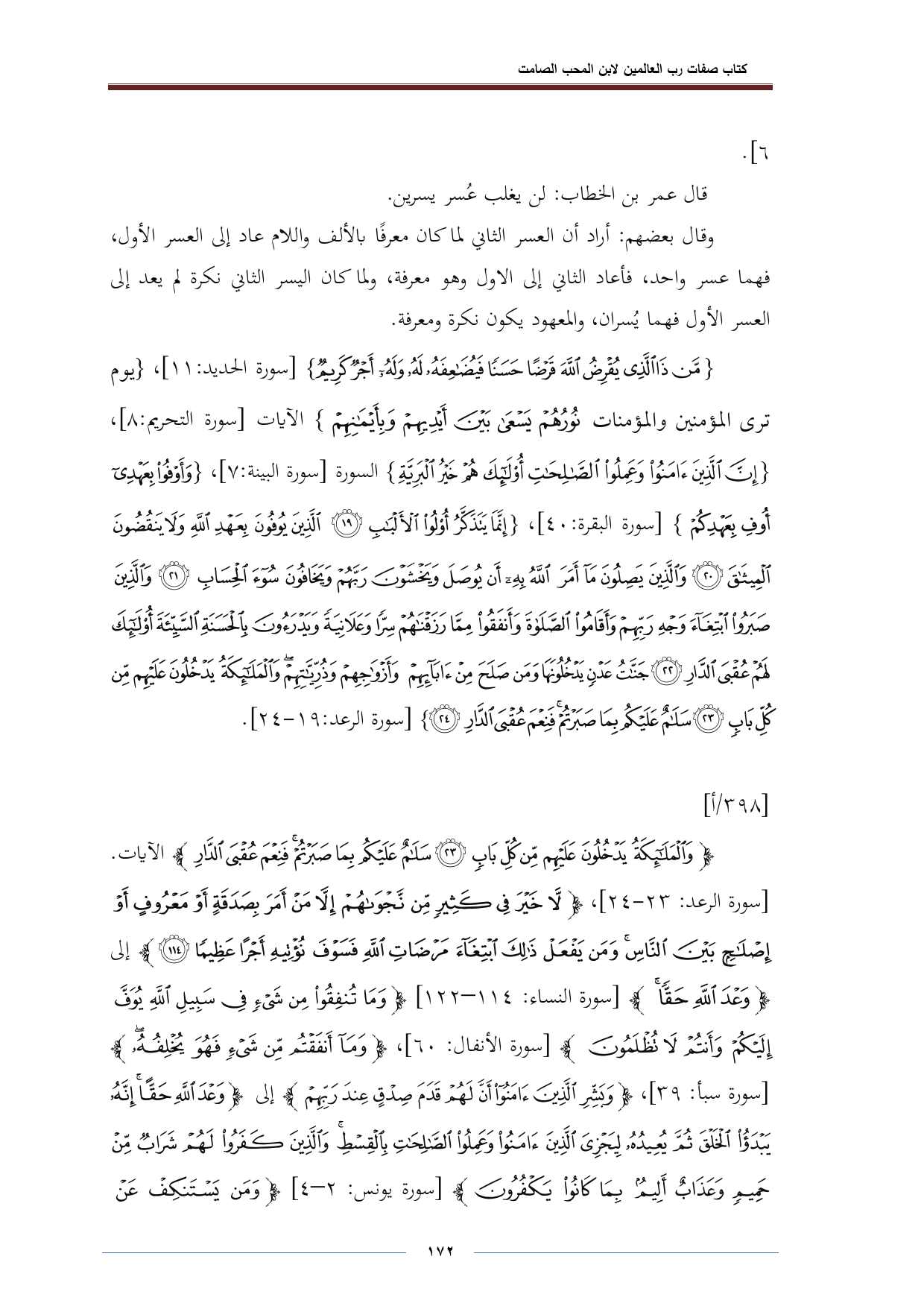 {مَنْ ذَا الَّذِي يُقْرِضُ اللَّهَ قَرْضًا حَسَنًا فَيُضَاعِفَهُ لَهُ وَلَهُ أَجْرٌ كَرِيمٌ} [سورة الحديد: ١١]، {نُورُهُمْ يَسْعَى بَيْنَ أَيْدِيهِمْ وَبِأَيْمَانِهِمْ} الآيات [سورة التحريم:٨]، {إِنَّ الَّذِينَ آمَنُوا وَعَمِلُوا الصَّالِحَاتِ أُولَئِكَ هُمْ خَيْرُ الْبَرِيَّةِ} السورة [سورة البينة: ٧]، {وَأَوْفُوا بِعَهْدِي أُوفِ بِعَهْدِكُمْ} [سورة البقرة: ٤٠]، {إِنَّمَا يَتَذَكَّرُ أُولُو الْأَلْبَابِ (١٩) الَّذِينَ يُوفُونَ بِعَهْدِ اللَّهِ وَلَا يَنْقُضُونَ الْمِيثَاقَ (٢٠) وَالَّذِينَ يَصِلُونَ مَا أَمَرَ اللَّهُ بِهِ أَنْ يُوصَلَ وَيَخْشَوْنَ رَبَّهُمْ وَيَخَافُونَ سُوءَ الْحِسَابِ (٢١) وَالَّذِينَ صَبَرُوا ابْتِغَاءَ وَجْهِ رَبِّهِمْ وَأَقَامُوا الصَّلَاةَ وَأَنْفَقُوا مِمَّا رَزَقْنَاهُمْ سِرًّا وَعَلَانِيَةً وَيَدْرَءُونَ بِالْحَسَنَةِ السَّيِّئَةَ أُولَئِكَ لَهُمْ عُقْبَى الدَّارِ (٢٢) جَنَّاتُ عَدْنٍ يَدْخُلُونَهَا وَمَنْ صَلَحَ مِنْ آبَائِهِمْ وَأَزْوَاجِهِمْ وَذُرِّيَّاتِهِمْ وَالْمَلَائِكَةُ يَدْخُلُونَ عَلَيْهِمْ مِنْ كُلِّ بَابٍ (٢٣) سَلَامٌ عَلَيْكُمْ بِمَا صَبَرْتُمْ فَنِعْمَ عُقْبَى الدَّارِ (٢٤)} [سورة الرعد: ١٩ - ٢٤].
