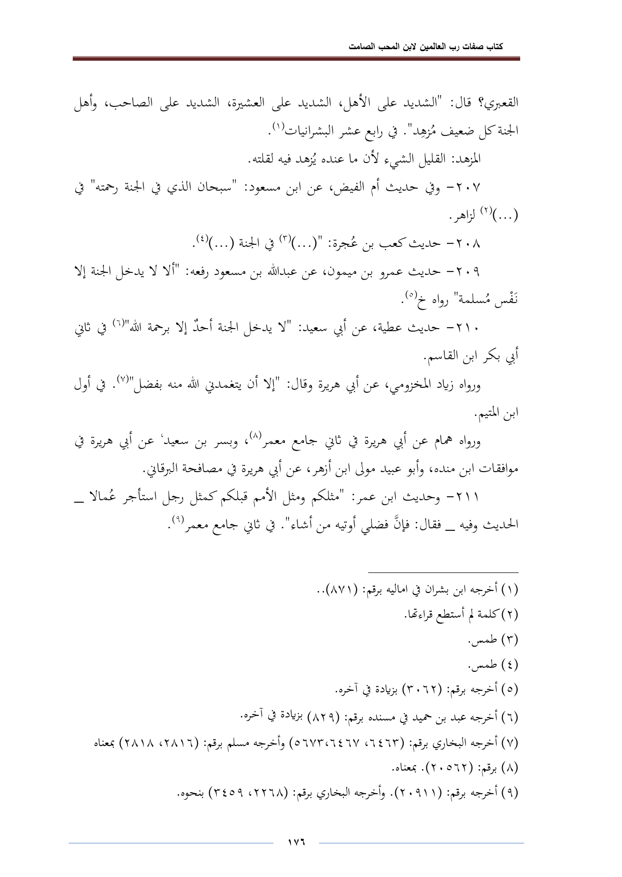 القعبري؟ قال: "الشديد على الأهل، الشديد على العشيرة، الشديد على الصاحب، وأهل الجنة كل ضعيف مُزهِد". في رابع عشر البشرانيات (¬١).