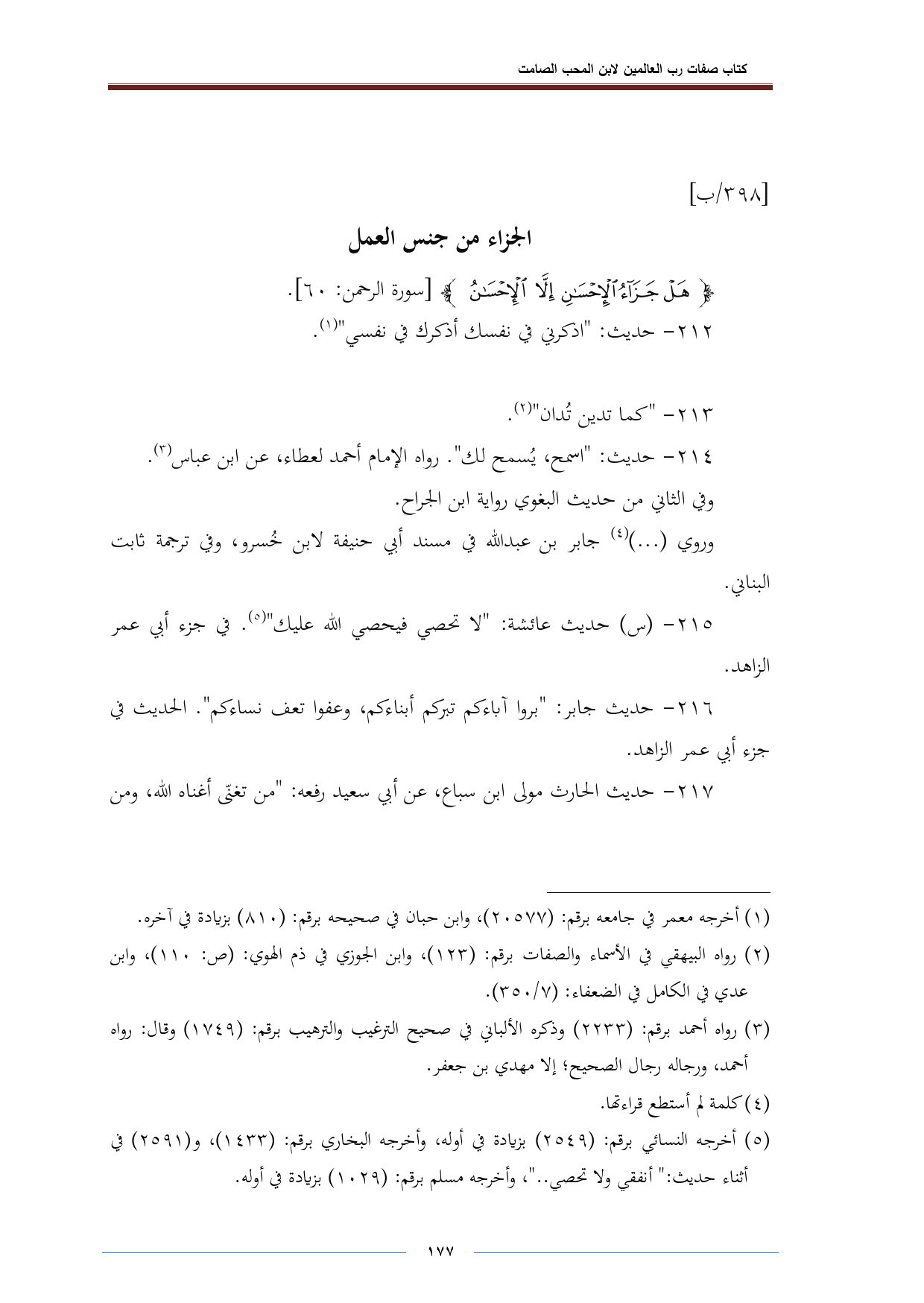٢١٦ - حديث جابر: "بروا آباءكم تبركم أبناءكم، وعفوا تعف نساءكم". الحديث في جزء أبي عمر الزاهد.