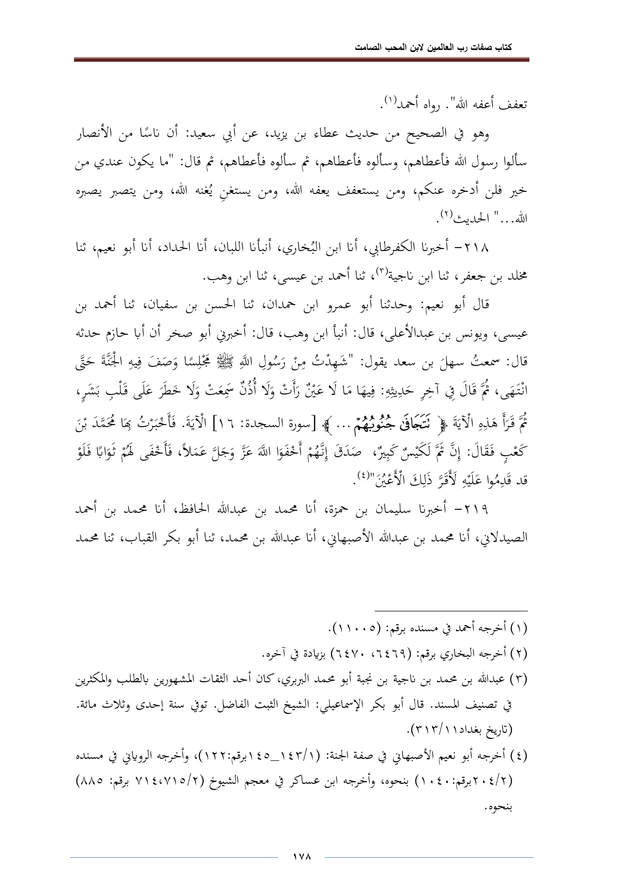 وهو في الصحيح حديث عطاء بن يزيد، عن أبي سعيد: أن ناسًا من الأنصار سألوا رسول الله فأعطاهم، وسألوه فأعطاهم، ثم سألوه فأعطاهم، ثم قال: "ما يكون عندي من خير فلن أدخره عنكم، ومن يستعفف يعفه الله، ومن يستغنِ يُغنه الله، ومن يتصبر يصبره الله ... " الحديث (¬٢).