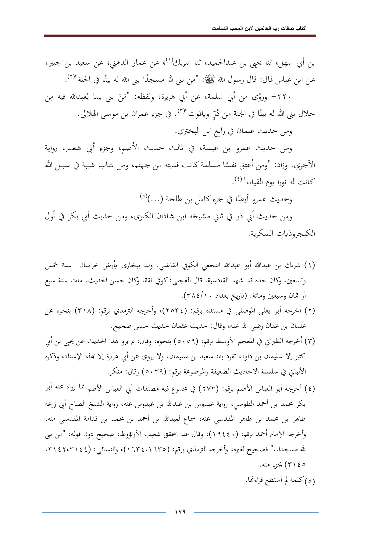 (¬٤) أخرجه أبو العباس الأصم برقم: (٢٧٣) في مجموع فيه مصنفات أبي العباس الأصم مم مما رواه عنه أبو بكر محمد بن أحمد الطوسي، رواية عبدوس بن عبد الله بن عبدوس عنه، رواية الشيخ الصالح أبي زرعة طاهر بن محمد بن طاهر المقدسي عنه، سماع لعبد الله بن أحمد بن محمد بن قدامة المقدسي منه. وأخرجه الإمام أحمد برقم: (١٩٤٤٠)، وقال عنه المحقق شعيب الأرنؤوط: صحيح دون قوله: "من بنى لله مسجدا .. " فصحيح لغيره، وأخرجه الترمذي برقم: (١٦٣٥، ١٦٣٤)، والنسائي: (٣١٤٤، ٣١٤٢، ٣١٤٥) بجزء منه.