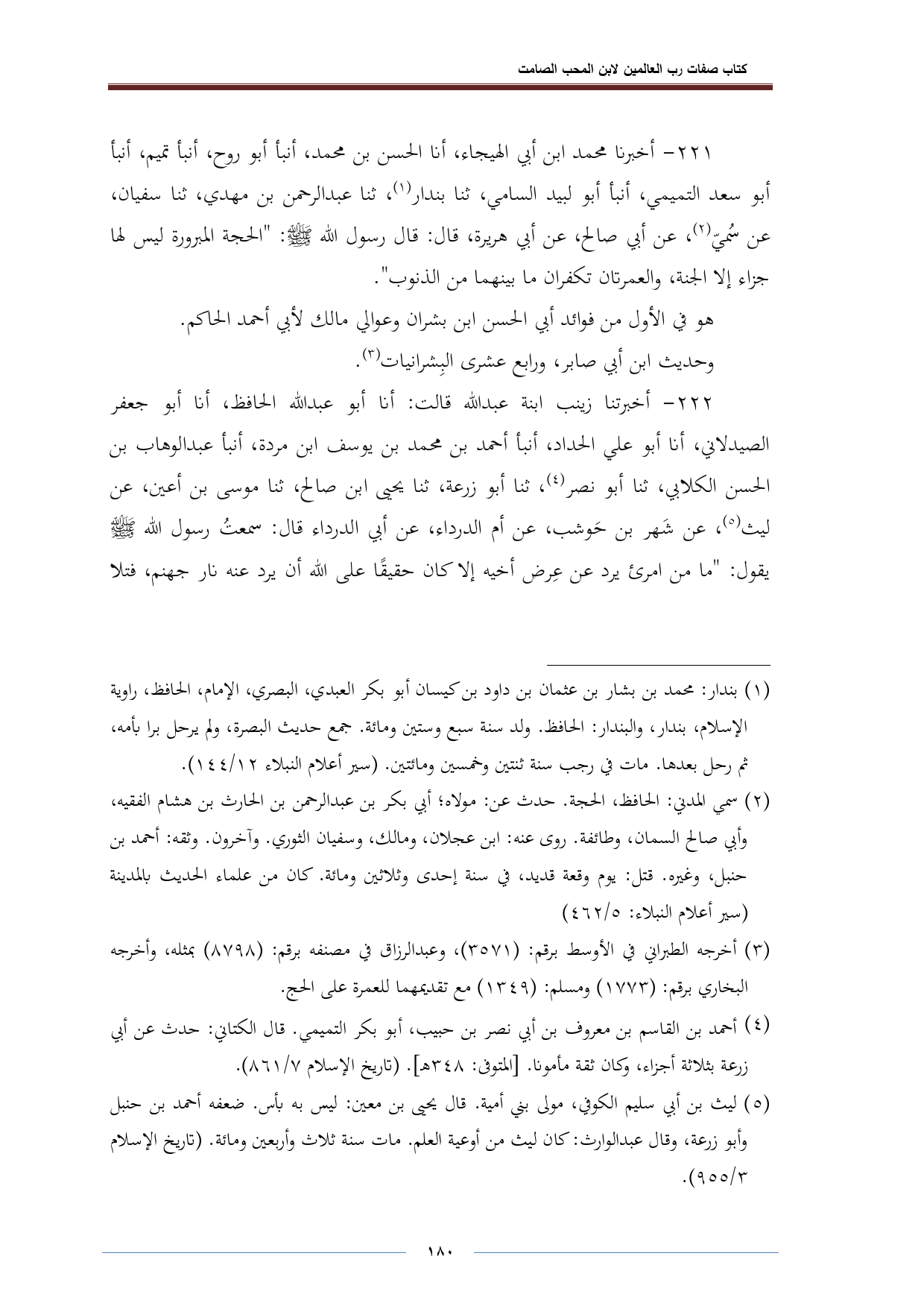 ٢٢١ - أخبرنا محمد ابن أبي الهيجاء، أنا الحسن بن محمد، أنبأ أبو روح، أنبأ تميم، أنبأ أبو سعد التميمي، أنبأ أبو لبيد السامي، ثنا بندار (¬١)، ثنا عبد الرحمن بن مهدي، تنا سفيان، عن سُميّ (¬٢)، عن أبي صالح، عن أبي هريرة، قال: قال رسول الله -صلى الله عليه وسلم-: "الحجة المبرورة ليس لها جزاء إلا الجنة، والعمرتان تكفران ما بينهما من الذنوب".