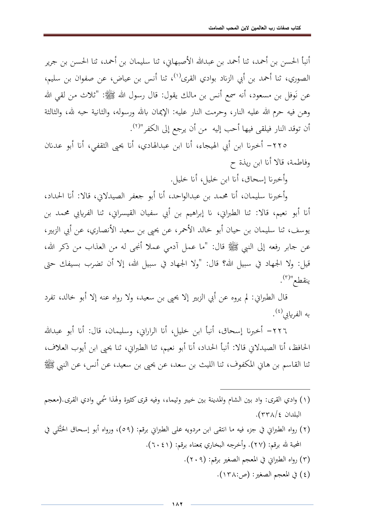 ٢٢٦ - أخبرنا إسحاق، أنبأ ابن خليل، أنا الراراني، وسليمان، قال: أنا أبو عبد الله الحافظ، أنا الصيدلاني قالا: أنبأ الحداد، أنا أبو نعيم، ثنا الطبراني، ثنا يحيى ابن أيوب العلاف، ثنا القاسم بن هاني المكفوف، ثنا الليث بن سعد، عن يحيى بن سعيد، عن أنس، عن النبي -صلى الله عليه وسلم-