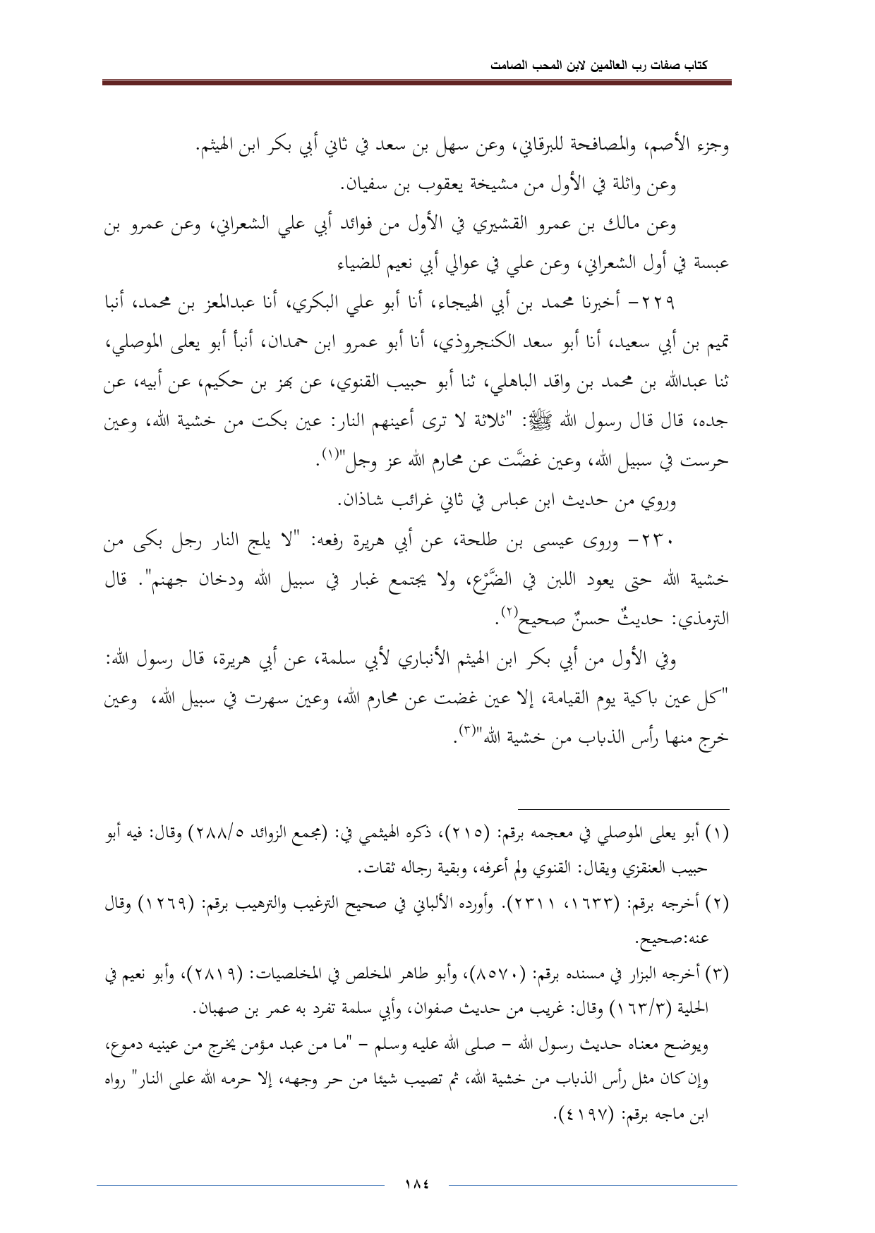 ٢٢٩ - أخبرنا محمد بن أبي الهيجاء، أنا أبو علي البكري، أنا عبد المعز بن محمد، أنبا تميم بن أبي سعيد، أنا أبو سعد الكنجروذي، أنا أبو عمرو ابن حمدان، أنبأ أبو يعلى الموصلي، ثنا عبد الله بن محمد بن واقد الباهلي، ثنا أبو حبيب القنوي، عن بهز بن حكيم، عن أبيه، عن جده، قال قال رسول الله -صلى الله عليه وسلم-: "ثلاثة لا ترى أعينهم النار: عين بكت من خشية الله، وعين حرست في سبيل الله، وعين غضَّت عن محارم الله عز وجل" (¬١).