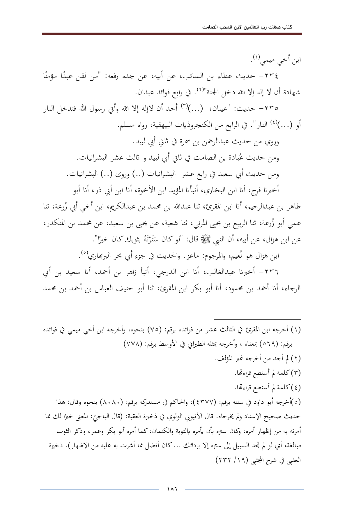 ٢٣٦ - أخبرنا عبد الغالب، أنا ابن الدرجي، أنبأ زاهر بن أحمد، أنا سعيد بن أبي الرجاء، أنا أحمد بن محمود، أنا أبو بكر ابن المقرئ، ثنا أبو حنيف العباس بن أحمد بن محمد
