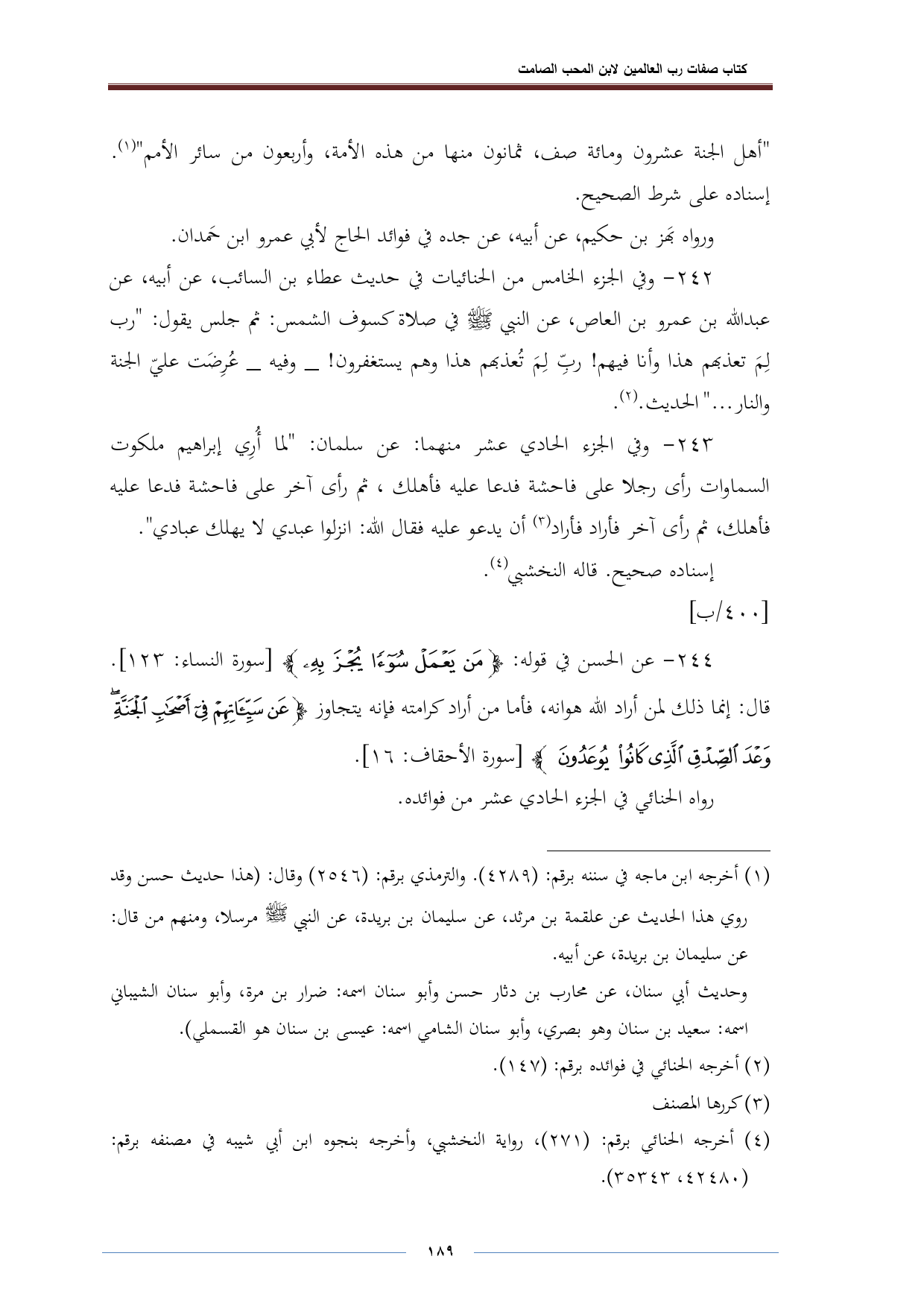 "أهلى الجنة عشرون ومائة صف، ثمانون منها من هذه الأمة، وأربعون من سائر الأمم" (¬١). إسناده على شرط الصحيح.