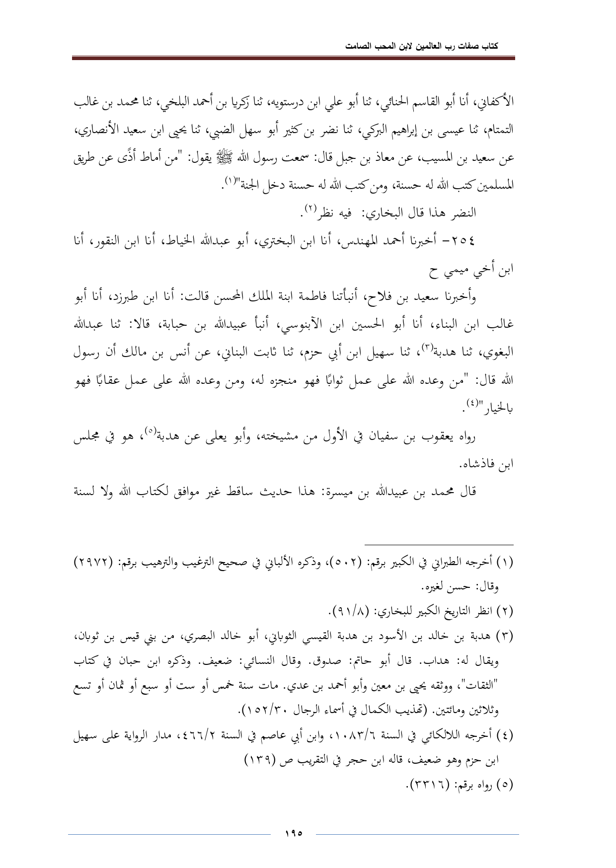 الأكفاني، أنا أبو القاسم الحنائي، ثنا أبو علي ابن درستويه، ثنا زكريا بن أحمد البلخي، ثنا محمد بن غالب التمتام، ثنا عيسى بن إبراهيم البركي، ثنا نضر بن كثير أبو سهل الضبي، ثنا يحيى ابن سعيد الأنصاري، عن سعيد بن المسيب، عن معاذ بن جبل قال: سمعت رسول الله -صلى الله عليه وسلم- يقول: "من أماط أذًى عن طريق المسلمين كتب الله له حسنة، ومن كتب الله له حسنة دخل الجنة" (¬١).