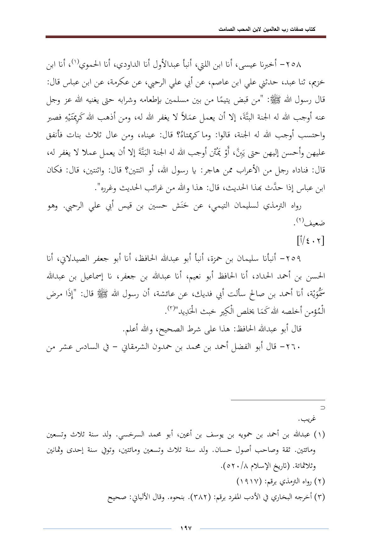 ٢٥٨ - أخبرنا عيسى، أنا ابن اللتي، أنبأ عبد الأول أنا الداودي، أنا الحموي (¬١)، أنا ابن خزيم، ثنا عبد، حدثني علي ابن عاصم، عن أبي علي الرحبي، عن عكرمة، عن ابن عباس قال: قال رسول الله -صلى الله عليه وسلم-: "من قبض يتيمًا من بين مسلمين بإطعامه وشرابه حتى يغنيه الله عز وجل عنه أوجب الله له الجنة البتَّةَ، إلا أن يعمل عمَلًا لا يغفر الله له، ومن أذهب الله كَرِيمَتَيْهِ فصبر واحتسب أوجب الله له الجنة، قالوا: وما كريمتاهُ؟ قال: عيناه، ومن عال ثلاث بنات فأنفق عليهن وأحسن إليهن حتى يَبِنَّ، أَوْ يَمُتْن أوجب الله له الجنة البَتَّةَ إلا أن يعمل عملا لا يغفر له، قال: فناداه رجل من الأعراب ممن هاجر: يا رسول الله، أو اثنتين؟ قال: واثنتين، قال: فكان ابن عباس إذا حدَّث بهذا الحديث، قال: هذا والله من غرائب الحديث وغرره".