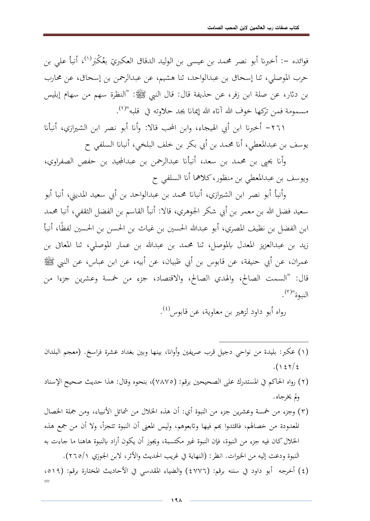 وأنبأ أبو نصر ابن الشيرازي، أنبأنا محمد بن عبد الواحد بن أبي سعيد المديني، أنبا أبو سعيد فضل الله بن معمر بن أبي شكر الجوهري، قالا: أنبأ القاسم بن الفضلى الثقفي، أنبا محمد ابن الفضل بن نظيف المصري، أبو عبد الله الحسين بن غياث بن الحسن بن الحسين لفظًا، أنبأ زيد بن عبد العزيز المعدل بالموصل، ثنا محمد بن عبد الله بن عمار الموصلي، ثنا المعافى بن عمران، عن أبي حنيفة، عن قابوس بن أبي ظبيان، عن أبيه، عن ابن عباس، عن النبي -صلى الله عليه وسلم- قال: "السمت الصالح، والهدي الصالح، والاقتصاد، جزء من خمسة وعشرين جزءا من النبوة" (¬٣).