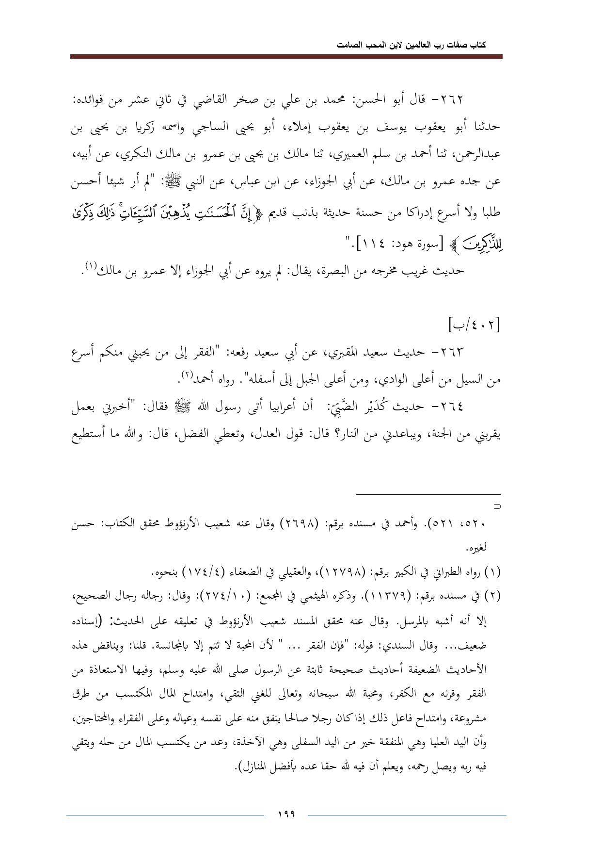 ٢٦٤ - حديث كُدَيْر الضَّبِّيّ: أن أعرابيا أتى رسول الله -صلى الله عليه وسلم- فقال: "أخبرني بعمل يقربني من الجنة، ويباعدني من النار؟ قال: قول العدل، وتعطي الفضل، قال: والله ما أستطيع
