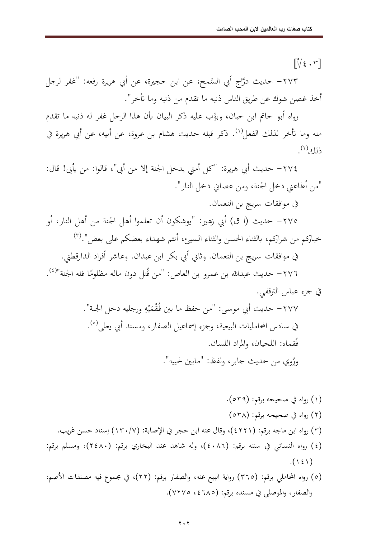 ٢٧٣ - حديث درَّاج أبي السمَّح، عن ابن حجيرة، عن أبي هريرة رفعه: "غفر لرجل أخذ غصن شوك عن طريق الناس ذنبه ما تقدم من ذنبه وما تأخر".