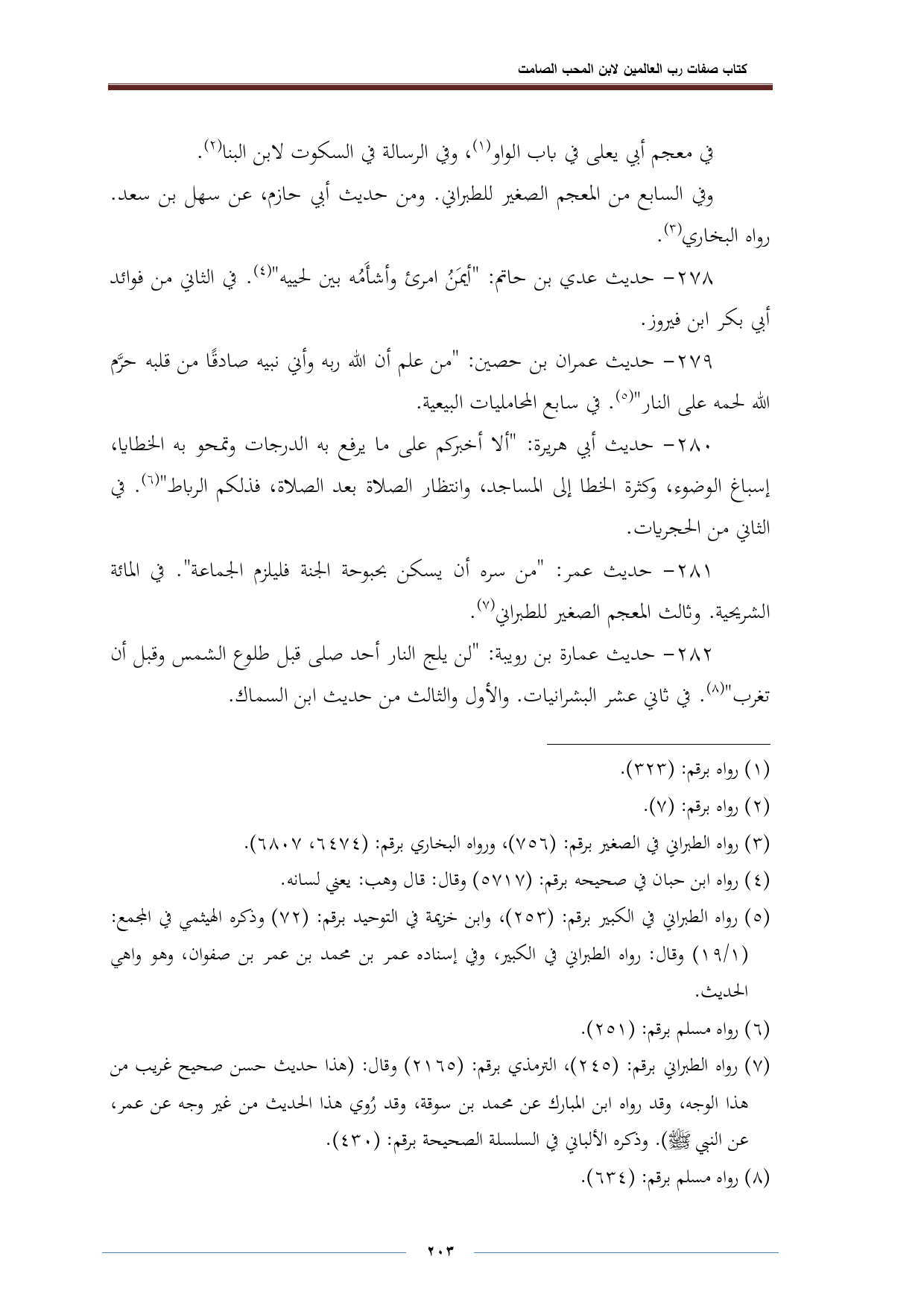 ٢٧٩ - حديث عمران بن حصين: "من علم أن الله ربه وأني نبيه صادقًا من قلبه حرَّم الله لحمه على النار" (¬٥). في سابع المحامليات البيعية.