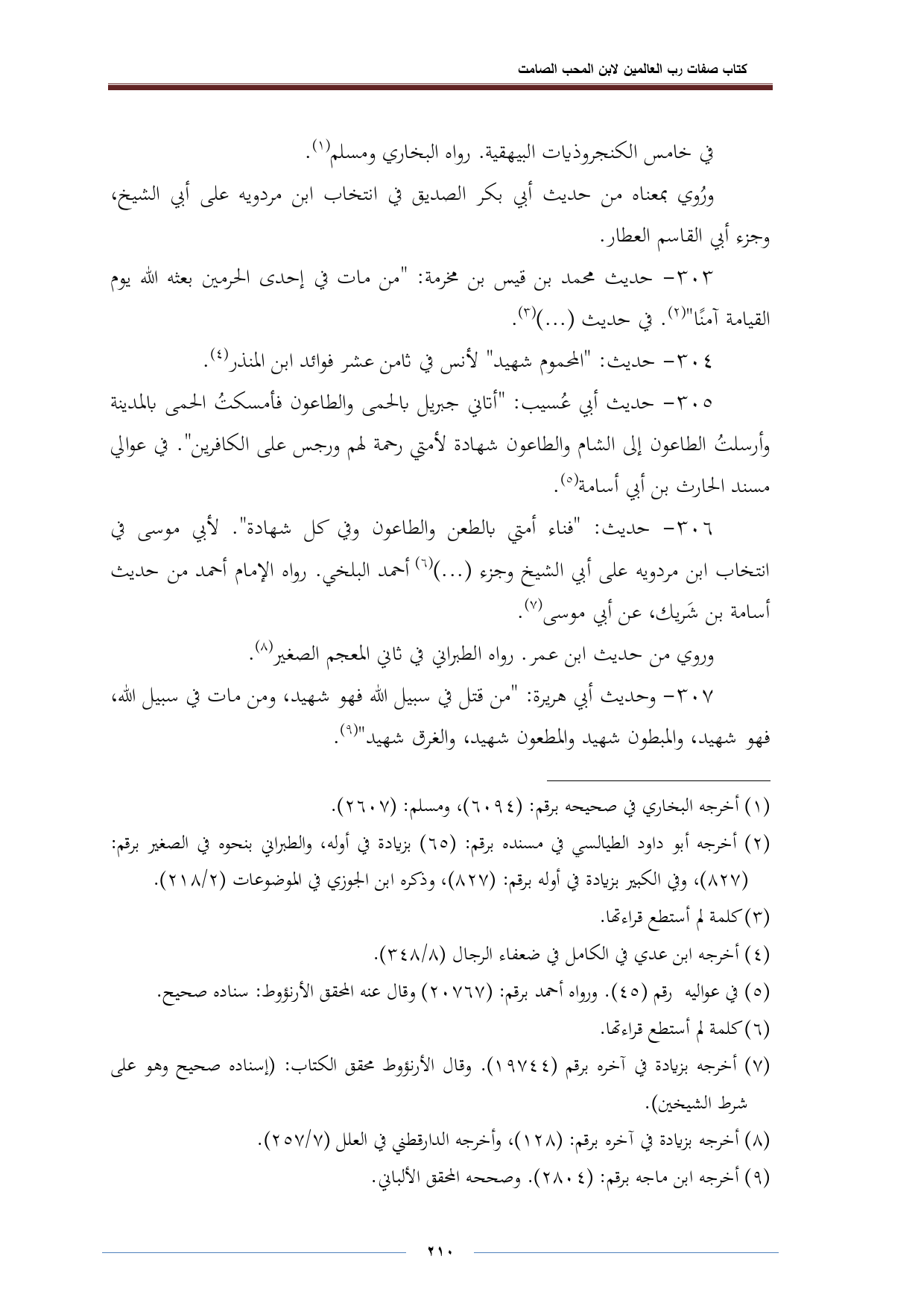 ٣٠٥ - حديث أبي عُسيب: "أتاني جبريل بالحمى والطاعون فأمسكتُ الحمى بالمدينة وأرسلتُ الطاعون إلى الشام والطاعون شهادة لأمتي رحمة لهم ورجس على الكافرين". في عوالي مسند الحارث بن أبي أسامة (¬٥).