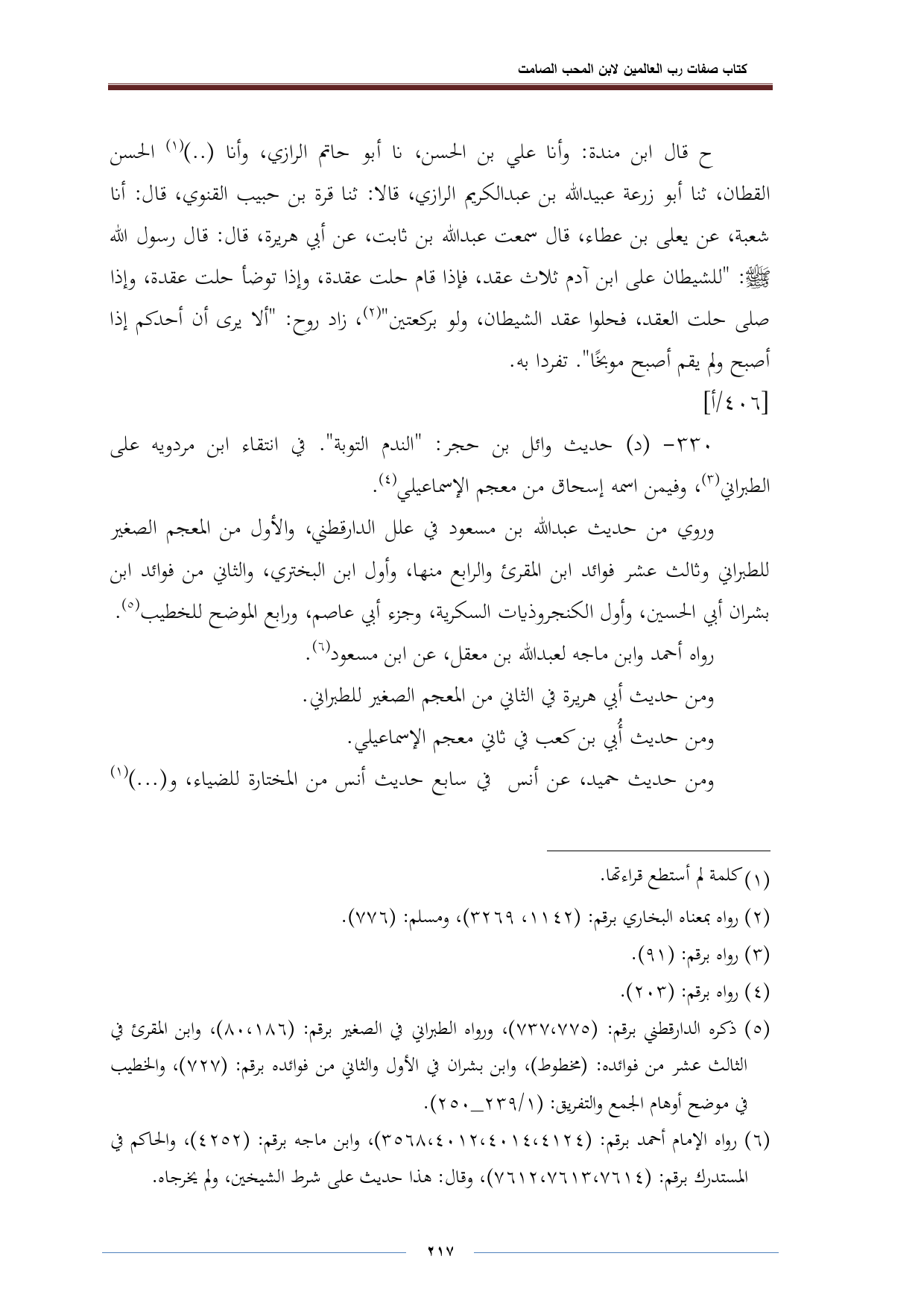 ح قال ابن مندة: وأنا علي بن الحسن، نا أبو حاتم الرازي، وأنا ( .. ) (¬١) الحسن القطان، ثنا أبو زرعة عبيد الله بن عبد الكريم الرازي، قالا: ثنا قرة بن حبيب القنوي، قال: أنا شعبة، عن يعلى بن عطاء، قال سمعت عبد الله بن ثابت، عن أبي هريرة، قال: قال رسول الله -صلى الله عليه وسلم-: "للشيطان على ابن آدم ثلاث عقد، فإذا قام حلت عقدة، وإذا توضأ حلت عقدة، وإذا صلى حلت العقد، فحلوا عقد الشيطان، ولو بركعتين" (¬٢)، زاد روح: "ألا يرى أن أحدكم إذا أصبع ولم يقم أصبع موبخًا". تفردا به.