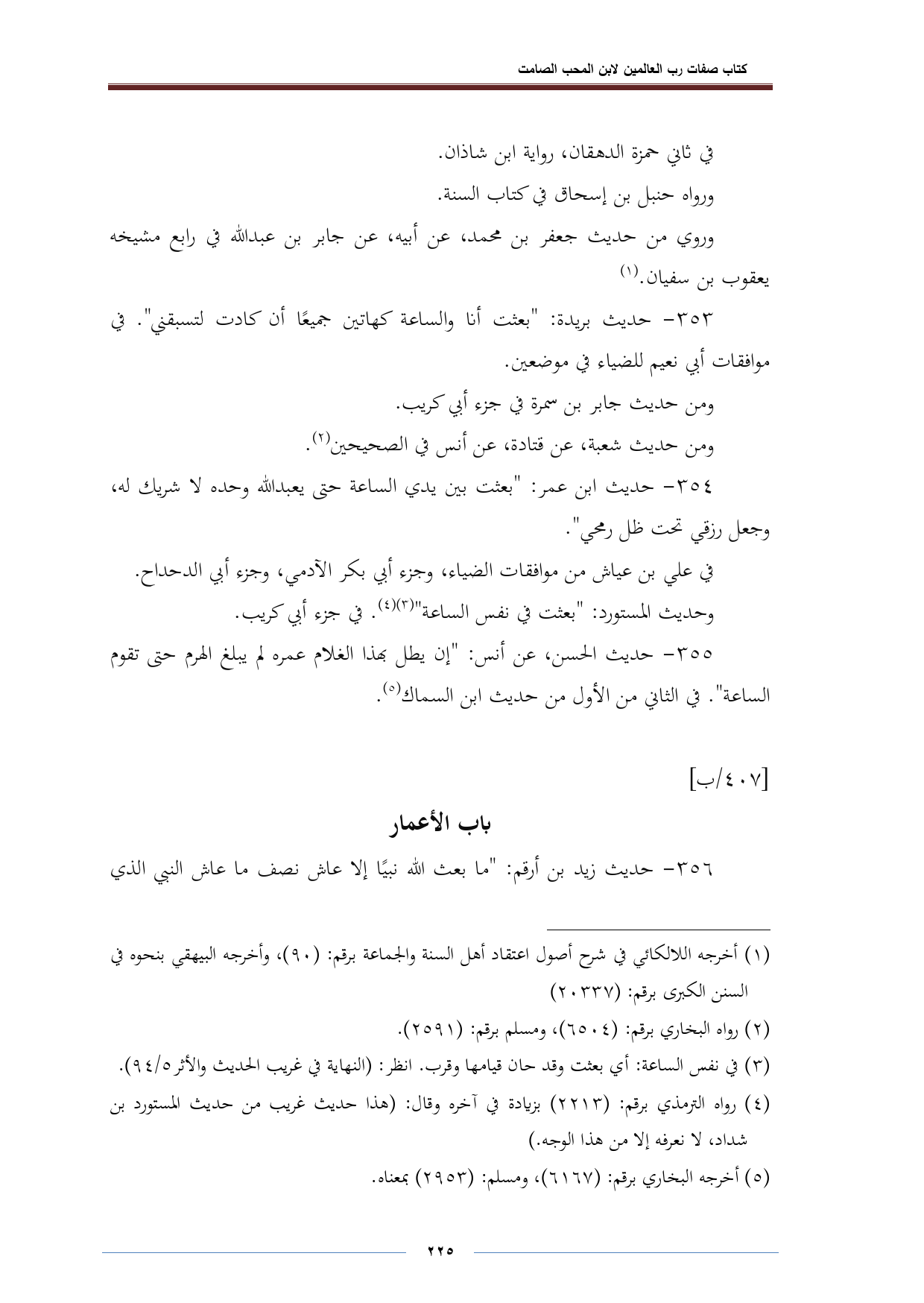 ٣٥٣ - حديث بريدة: "بعثت أنا والساعة كهاتين جميعًا أن كادت لتسبقني". في موافقات أبي نعيم للضياء في موضعين.